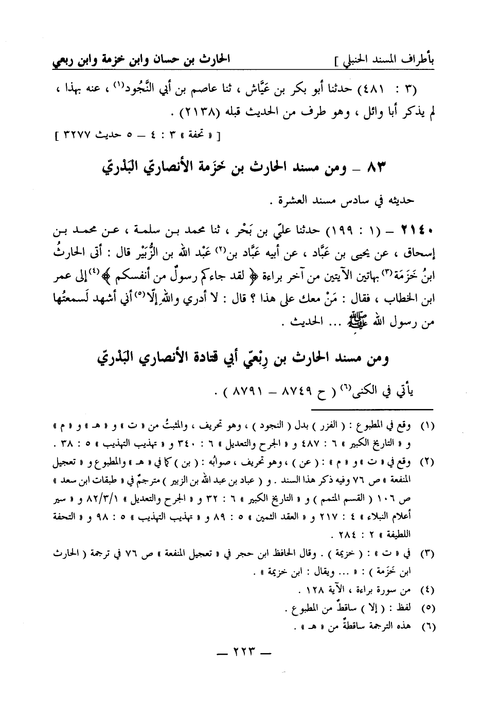2140 - (1: 199) حدثنا علي بن بحر ثنا محمد بن سلمة عن محمد بن إسحاق عن يحيى بن عباد عن أبيه عباد بن عبد الله بن الزبير قال: أتى الحارث بن خزمة بهاتين الآيتين من آخر براءة لقد جاءكم رسول من أنفسكم إلى عمر بن الخطاب فقال: من معك على هذا؟ قال لا أدري والله إلا أني أشهد لسمعتها من رسول الله صَلَّى اللَّهُ عَلَيْهِ وَسَلَّمَ..... الحديث ومن مسند الحارث بن ربعي أبي قتادة الأنصاري البدري يأتي في الكنى (ح 8749 - 8791)