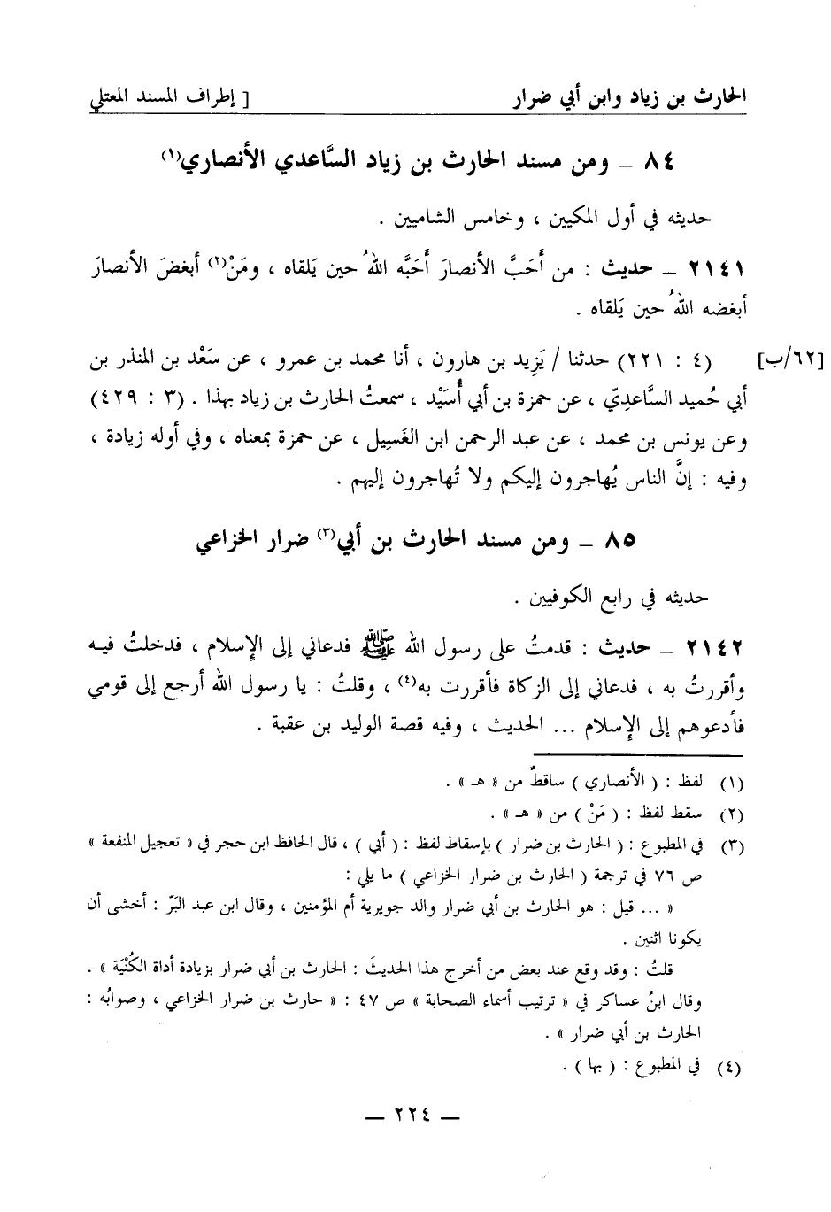 ومن مسند الحارث بن زياد الساعدي الأنصاري حديثه في أول المكيين وخامس الشاميين