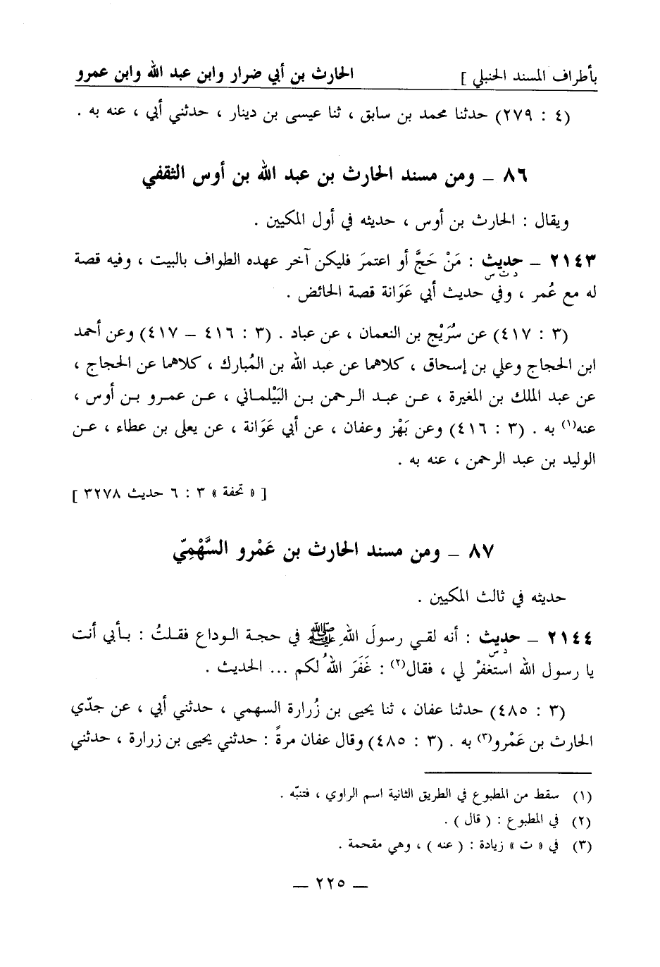 ومن مسند الحارث بن عمرو السهمي حديثه في ثالث المكيين