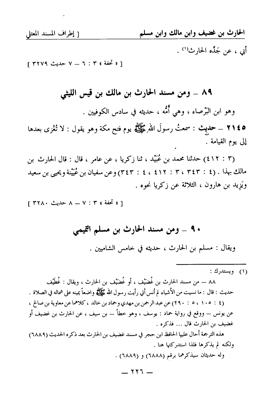 ومن مسند الحارث بن مالك بن قيس الليثي وهو ابن البرصاء وهي أمه حديثه في سادس الكوفيين