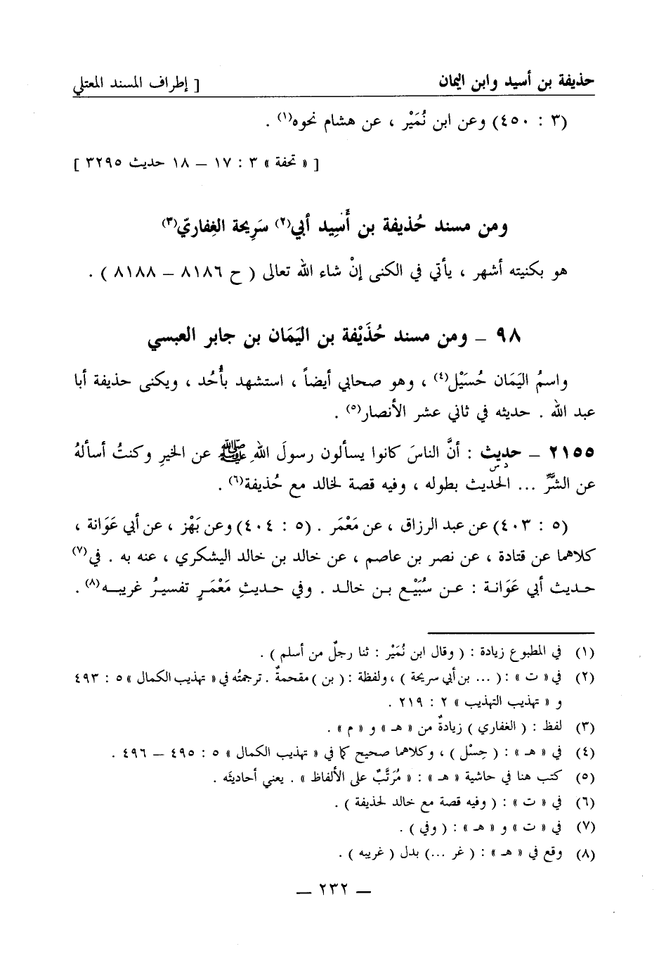 ومن مسند حذيفة بن اليمان بن جابر العبسي واسم اليمان حسيل وهو صحابي أيضا استشهد بأحد ويكنى حذيفة أبا عبد الله حديثه في ثاني عشر الأنصار