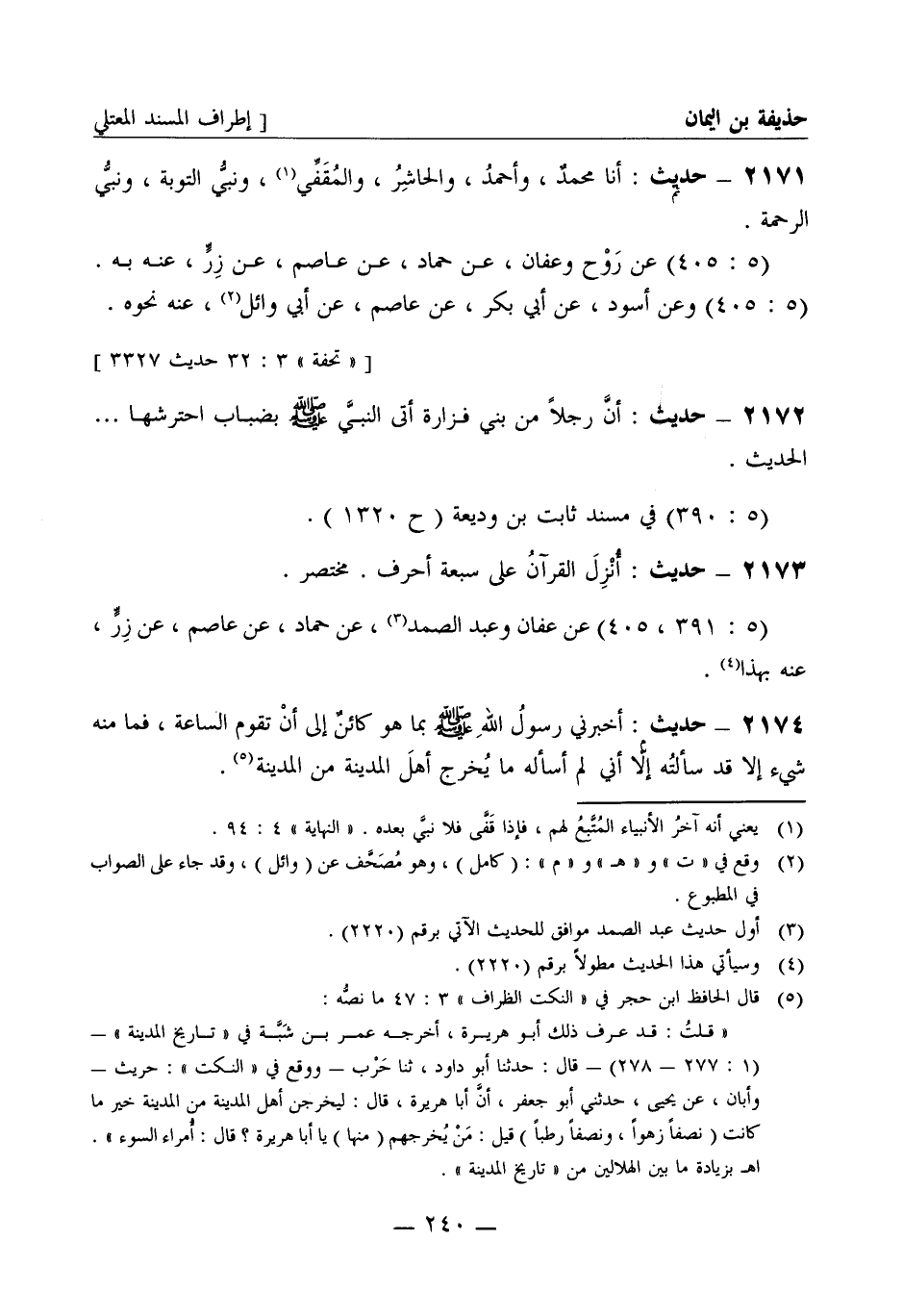 2173 - حديث: أنزل القرآن على سبعة أحرف مختصر (5: 391، 405) عن عفان وعبد الصمد عن حماد عن عاصم عن زر عنه بهذا