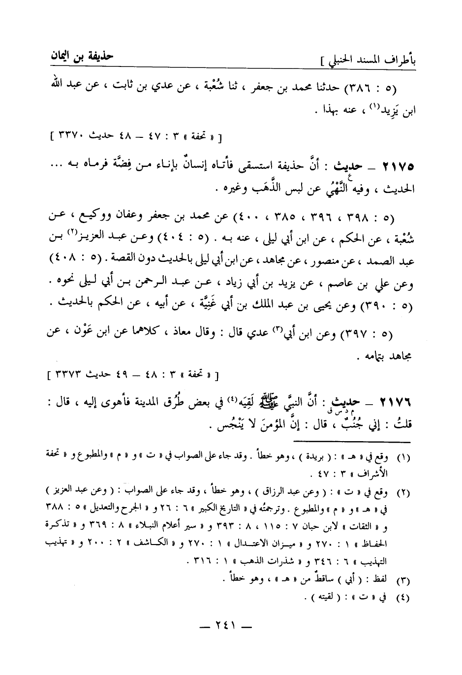 2176 -[م د س ق] حديث: أن النبي صَلَّى اللَّهُ عَلَيْهِ وَسَلَّمَ لقيه في بعض طرق المدينة فأهوى إليه قال: قلت إني جنب قال: إن المؤمن لا ينجس -[242]- (5: 384) حدثنا يحيى بن سعيد عن مسعر حدثني واصل عن أبي وائل عنه بهذا (5: 402) وعن وكيع عن مسعر نحوه (5: 402) وعن وكيع عن يزيد بن إبراهيم عن ابن سيرين عن حذيفة نحوه