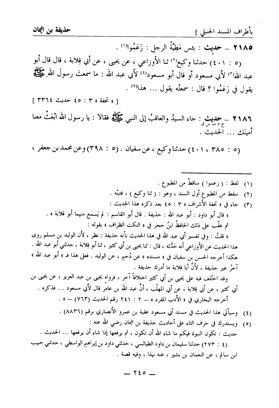 2185 -[د] حديث: بئس مطية الرجل زعموا (5: 401) حدثنا وكيع ثنا الأوزاعي عن يحيى عن أبي قلابة قال قال أبو عبد الله لأبي مسعود أو قال أبو مسعود لأبي عبد الله ما سمعت رسول الله صَلَّى اللَّهُ عَلَيْهِ وَسَلَّمَ يقول في زعموا؟ قال: سمعته يقول ... . هذا