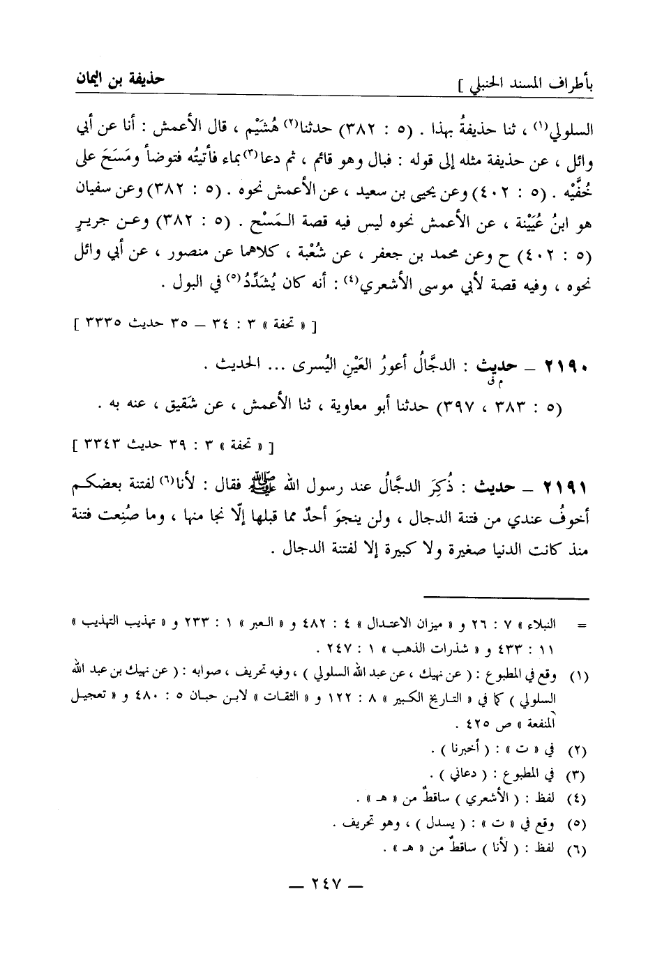 2191 - حديث: ذكر الدجال عند رسول الله صَلَّى اللَّهُ عَلَيْهِ وَسَلَّمَ فقال: لأنا لفتنة بعضكم أخوف عندي من فتنة الدجال ولن ينجو أحد مما قبلها إلا نجا منها وما صنعت فتنة منذ كانت الدنيا صغيرة ولا كبيرة إلا لفتنة الدجال -[248]- (5: 389) حدثنا وهب بن جرير ثنا أبي سمعت الأعمش عن أبي وائل عنه بهذا