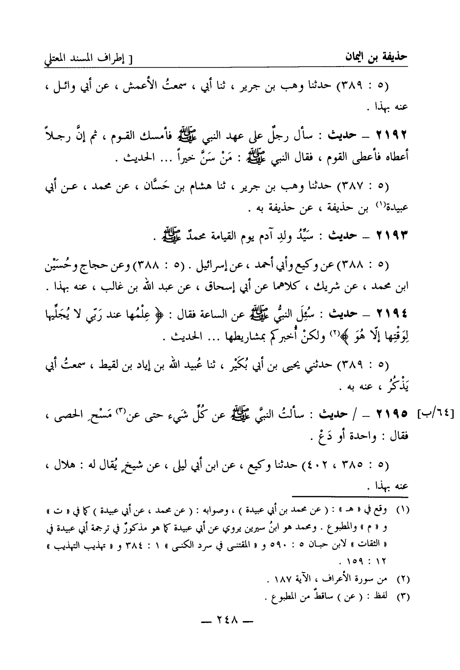 2192 - حديث: سأل رجل على عهد النبي صَلَّى اللَّهُ عَلَيْهِ وَسَلَّمَ فأمسك القوم ثم إن رجلا أعطاه فأعطى القوم فقال النبي صَلَّى اللَّهُ عَلَيْهِ وَسَلَّمَ من سن خيرا ... ... . الحديث (5: 387) حدثنا وهب بن جرير ثنا هشام بن حسان عن محمد عن أبي عبيدة بن حذيفة عن حذيفة به
