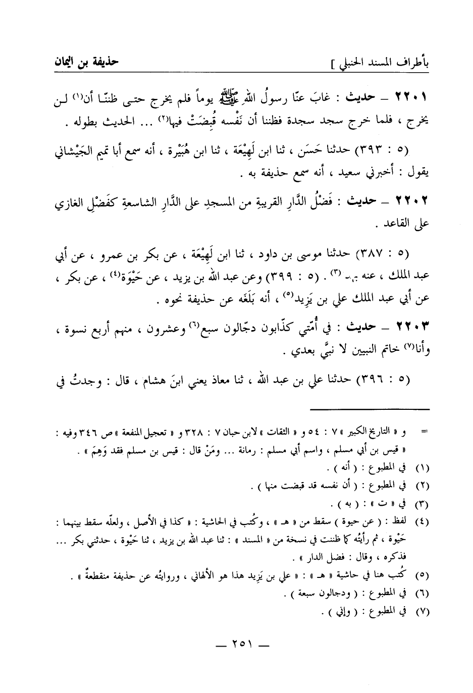 2201 - حديث: غاب عنا رسول الله صَلَّى اللَّهُ عَلَيْهِ وَسَلَّمَ يوما فلم يخرج حتى ظننا أن لن يخرج فلما خرج سجد سجدة فظننا أن نفسه قبضت فيها ... ... . الحديث بطوله (5: 393) حدثنا حسن ثنا ابن لهيعة ثنا ابن هبيرة أنه سمع أبا تميم الجيشاني يقول أخبرني سعيد أنه سمع حذيفة به