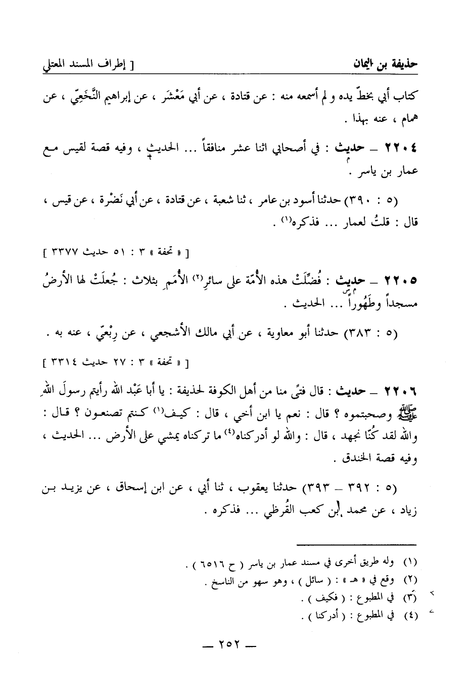 2206 - حديث: قال فتى منا من أهل الكوفة لحذيفة يا أبا عبد الله رأيتم رسول الله صَلَّى اللَّهُ عَلَيْهِ وَسَلَّمَ وصحبتموه؟ قال: نعم يا ابن أخي قال: كيف كنتم تصنعون؟ قال والله لقد كنا نجهد قال والله لو أدركناه ما تركناه يمشي على الأرض ... ... . الحديث وفيه قصة الخندق (5: 392 - 393) حدثنا يعقوب ثنا أبي عن ابن إسحاق عن يزيد بن زياد عن محمد بن كعب القرظي..... فذكره