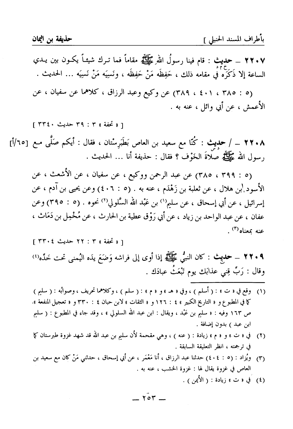 2208 -[د س] حديث: كنا مع سعيد بن العاص بطبرستان فقال: أيكم صلى مع رسول الله صَلَّى اللَّهُ عَلَيْهِ وَسَلَّمَ صلاة الخوف؟ فقال: حذيفة أنا ... ... . الحديث (5: 399، 385) عن عبد الرحمن ووكيع عن سفيان عن الأشعث عن الأسود بن هلال عن ثعلبة بن زهدم عنه به (5: 406) وعن يحيى بن آدم عن إسرائيل عن أبي إسحاق عن سليم بن عبد الله السلولي نحوه (5: 395) وعن عفان عن عبد الواحد بن زياد عن أبي روق عطية بن الحارث عن مخمل بن دماث عنه بمعناه