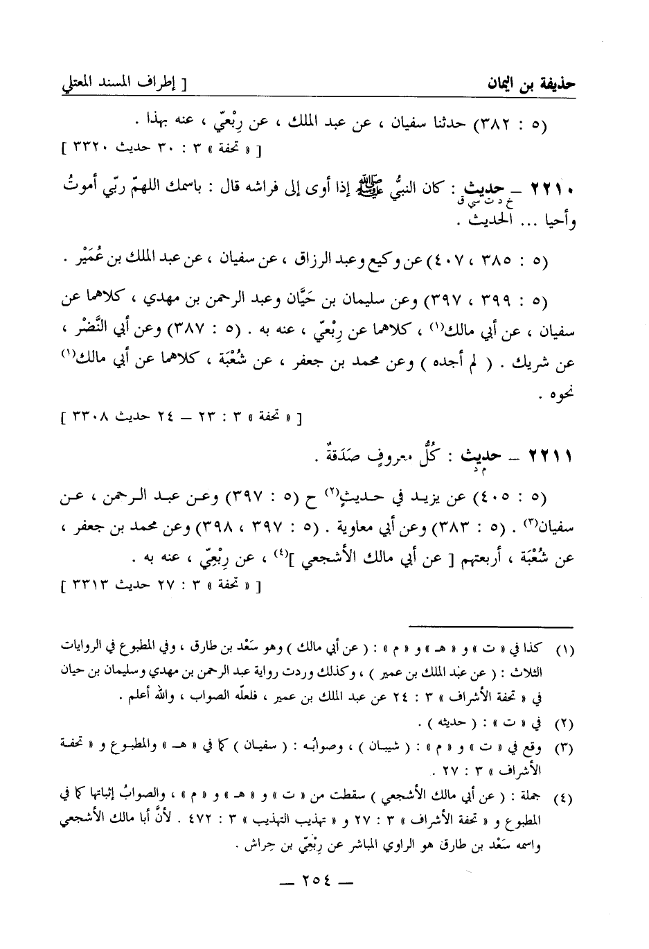 2210 -[خ د ت سي ق] حديث: كان النبي صَلَّى اللَّهُ عَلَيْهِ وَسَلَّمَ إذا أوى إلى فراشه قال باسمك اللهم ربي أموت وأحيا ... ... . الحديث (5: 385، 407) عن وكيع وعبد الرزاق عن سفيان عن عبد الملك بن عمير (5: 399، 397) وعن سليمان بن حيان وعبد الرحمن بن مهدي كلاهما عن سفيان عن أبي مالك كلاهما عن ربعي عنه به (5: 387) وعن أبي النضر عن شريك (لم أجده) وعن محمد بن جعفر عن شعبة كلاهما عن أبي مالك نحوه