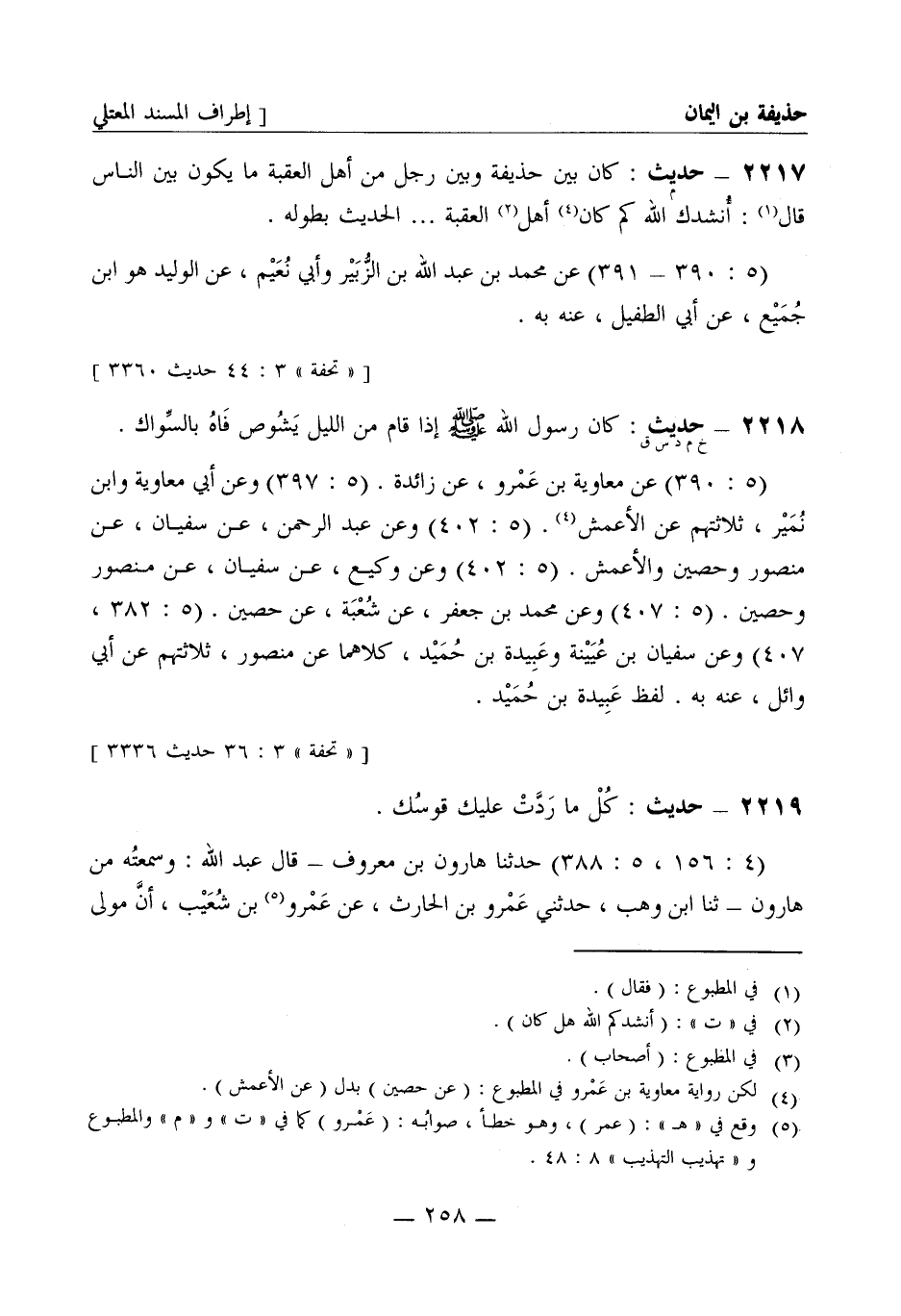 2218 -[خ م د س ق] حديث: كان رسول الله صَلَّى اللَّهُ عَلَيْهِ وَسَلَّمَ إذا قام من الليل يشوص فاه بالسواك (5: 390) عن معاوية بن عمرو عن زائدة (5: 397) وعن أبي معاوية وابن نمير ثلاثتهم عن الأعمش (5: 402) وعن عبد الرحمن عن سفيان عن منصور وحصين والأعمش (5: 402) وعن وكيع عن سفيان عن منصور وحصين (5: 407) وعن محمد بن جعفر عن شعبة عن حصين (5: 382، 407) وعن سفيان بن عيينة وعبيدة بن حميد كلاهما عن منصور ثلاثتهم عن أبي وائل عنه به لفظ عبيدة بن حميد