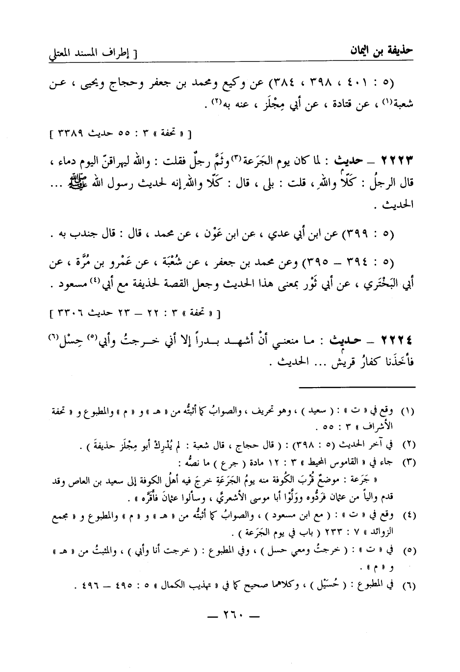 2223 -[م] حديث: لما كان يوم الجرعة وثم رجل فقلت والله ليهراقن اليوم دماء قال الرجل كلا والله قلت: بلى قال كلا والله إنه لحديث رسول الله صَلَّى اللَّهُ عَلَيْهِ وَسَلَّمَ ... ... . الحديث (5: 399) عن ابن أبي عدي عن ابن عون عن محمد قال قال جندب به (5: 394 - 395) وعن محمد بن جعفر عن شعبة عن عمرو بن مرة عن أبي البختري عن أبي ثور بمعنى هذا الحديث وجعل القصة لحذيفة مع أبي مسعود
