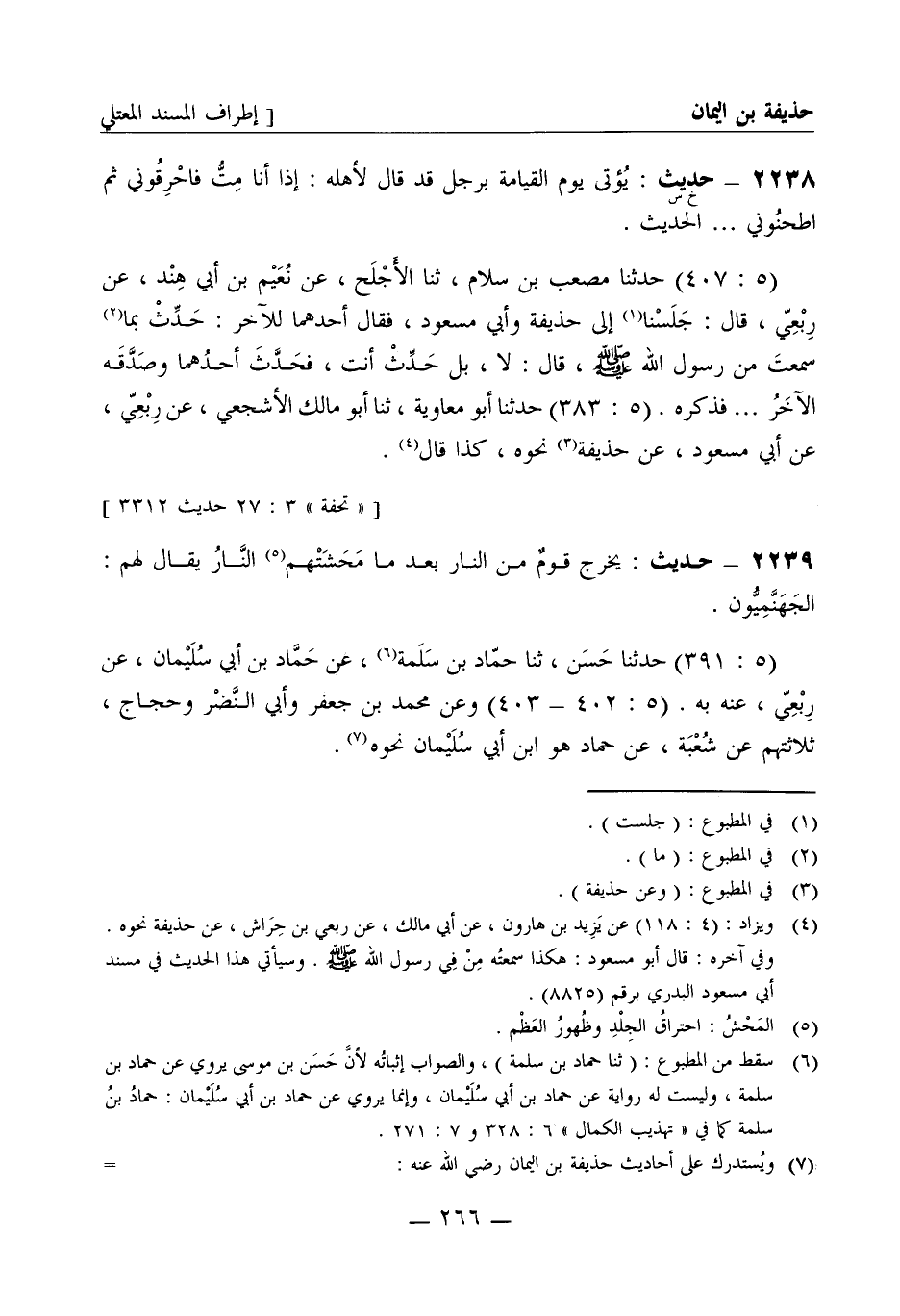 2238 -[خ س] حديث: يؤتى يوم القيامة برجل قد قال لأهله إذا أنا مت فاحرقوني ثم اطحنوني ... ... . الحديث (5: 407) حدثنا مصعب بن سلام ثنا الأجلح عن نعيم بن أبي هند عن ربعي قال: جلسنا إلى حذيفة وأبي مسعود فقال: أحدهما للآخر حدث بما سمعت من رسول الله صَلَّى اللَّهُ عَلَيْهِ وَسَلَّمَ قال لا بل حدث أنت فحدث أحدهما وصدقه الآخر ... . فذكره (5: 383) حدثنا أبو معاوية ثنا أبو مالك الأشجعي عن ربعي عن أبي مسعود عن حذيفة نحوه كذا قال