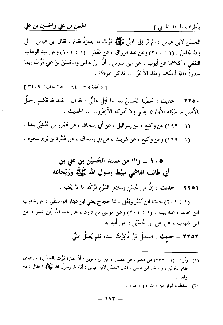 2251 - حديث: إن من حسن إسلام المرء تركه ما لا يعنيه (1: 201) حدثنا ابن نمير ويعلى ثنا حجاج يعني ابن دينار الواسطي عن شعيب بن خالد عنه بهذا (1: 201) وعن موسى بن داود عن عبد الله بن عمر عن ابن شهاب عن علي بن حسين عن أبيه به