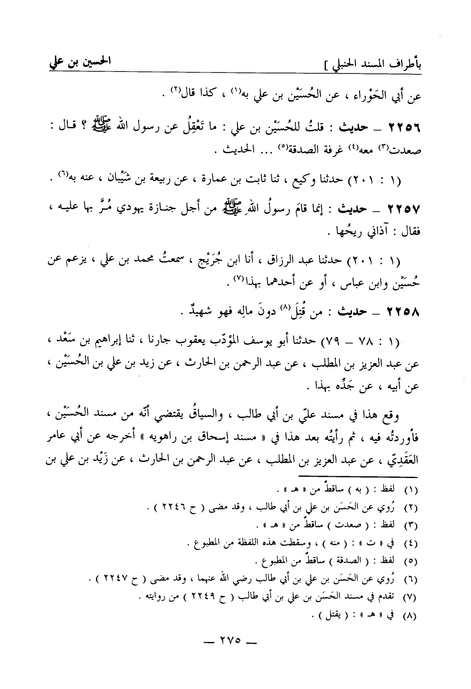 2258 - حديث: من قتل دون ماله فهو شهيد (1: 78 - 79) حدثنا أبو يوسف المؤدب يعقوب جارنا ثنا إبراهيم بن سعد عن عبد العزيز بن المطلب عن عبد الرحمن بن الحارث عن زيد بن علي بن الحسين عن أبيه عن جده بهذا وقع هذا في مسند علي بن أبي طالب والسياق يقتضي أنه من مسند الحسين فأوردته فيه ثم رأيته بعد هذا في مسند إسحاق بن راهويه أخرجه عن أبي عامر العقدي عن عبد العزيز بن المطلب عن عبد الرحمن بن الحارث عن زيد بن علي بن -[276]- الحسين عن أبيه عن علي بن أبي طالب فيحول إلى مسند علي مع إرساله (ح 6369)