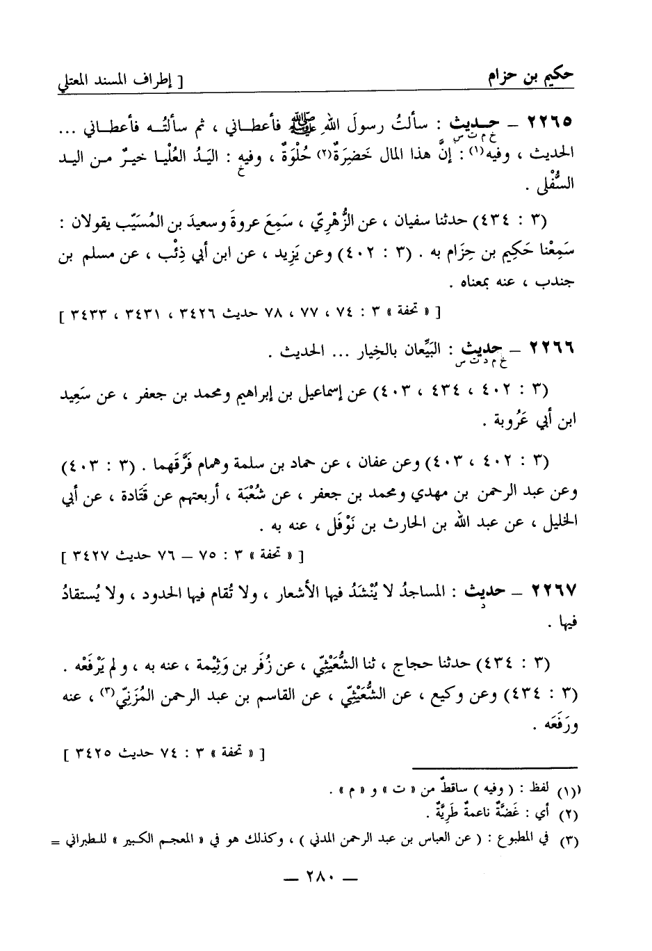 2265 -[خ م ت س] حديث: سألت رسول الله صَلَّى اللَّهُ عَلَيْهِ وَسَلَّمَ فأعطاني ثم سألته فأعطاني ... ... . الحديث وفيه إن هذا المال خضرة حلوة وفيه (خ) : اليد العليا خير من اليد السفلى (3: 434) حدثنا سفيان عن الزهري سمع عروة وسعيد بن المسيب يقولان سمعنا حكيم بن حزام به (3: 402) وعن يزيد عن ابن أبي ذئب عن مسلم بن جندب عنه بمعناه