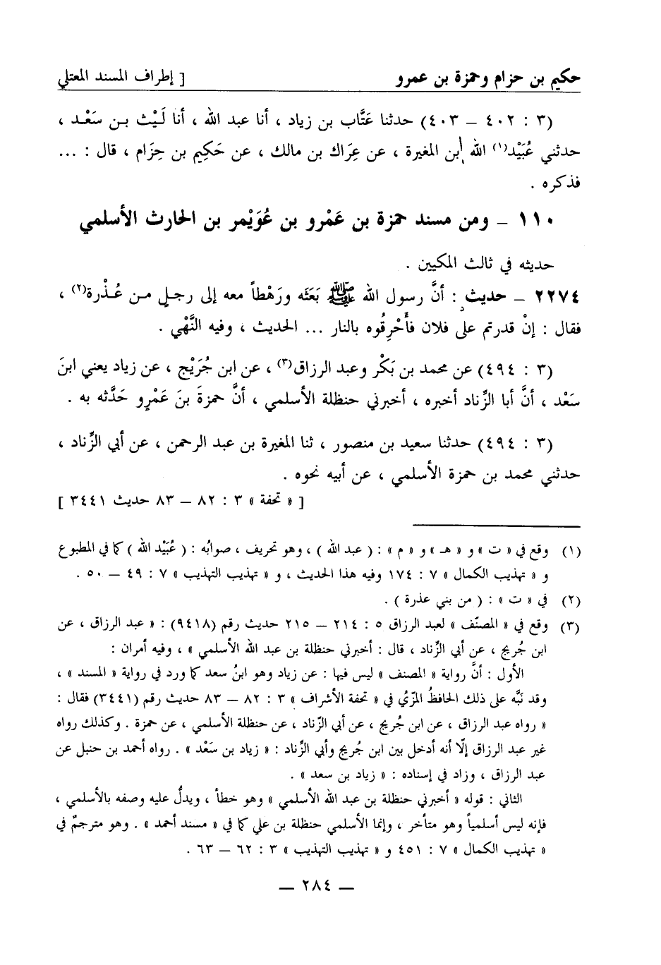 2274 -[د] حديث: أن رسول الله صَلَّى اللَّهُ عَلَيْهِ وَسَلَّمَ بعثه ورهطا معه إلى رجل من عذرة فقال: إن قدرتم على فلان فأحرقوه بالنار ... ... . الحديث وفيه النهي (3: 494) عن محمد بن بكر وعبد الرزاق عن ابن جريج عن زياد يعني ابن سعد أن أبا الزناد أخبره أخبرني حنظلة الأسلمي أن حمزة بن عمرو حدثه به (3: 494) حدثنا سعيد بن منصور ثنا المغيرة بن عبد الرحمن عن أبي الزناد حدثني محمد بن حمزة الأسلمي عن أبيه نحوه
