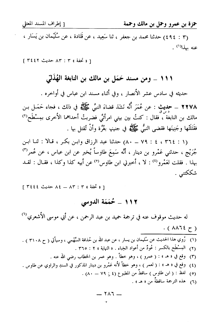 ومن مسند حمل بن مالك بن النابغة الهذلي حديثه في سادس عشر الأنصار وفي أثناء مسند ابن عباس في أواخره
