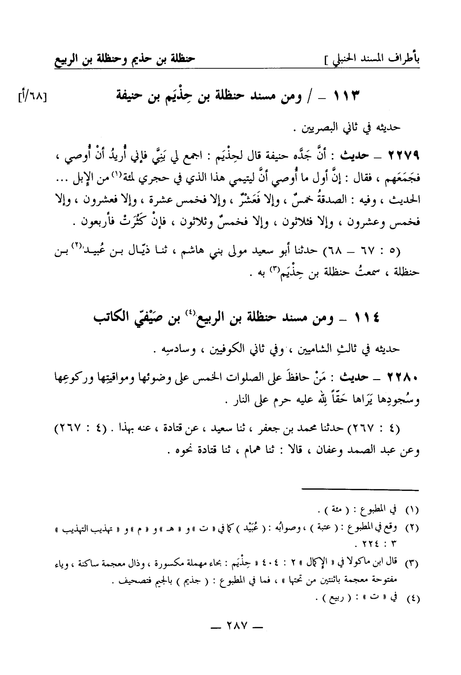 2279 - حديث: أن جده حنيفة قال لحذيم: اجمع لي بني فإني أريد أن أوصي فجمعهم فقال إن أول ما أوصي أن ليتيمي هذا الذي في حجري لمائة من الإبل ... ... . الحديث وفيه الصدقة خمس وإلا فعشر وإلا فخمس عشرة وإلا فعشرون وإلا فخمس وعشرون وإلا فثلاثون وإلا فخمس وثلاثون فإن كثرت فأربعون (5: 67 - 68) حدثنا أبو سعيد مولى بني هاشم ثنا ذيال بن عبيد بن حنظلة سمعت حنظلة بن حذيم به