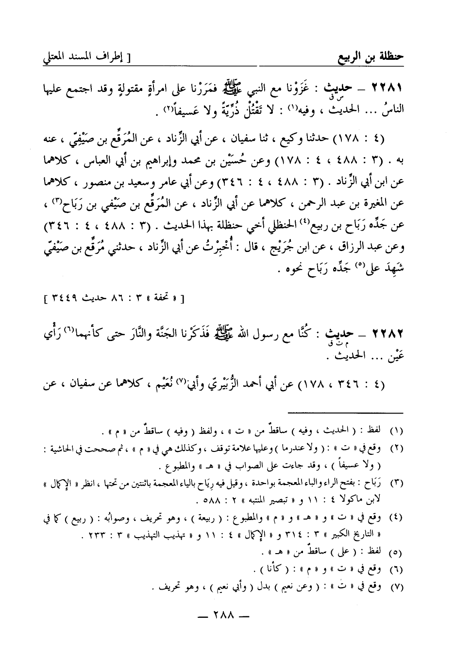 2281 -[س ق] حديث: غزونا مع النبي صَلَّى اللَّهُ عَلَيْهِ وَسَلَّمَ فمررنا على امرأة مقتولة وقد اجتمع عليها الناس ... ... . الحديث وفيه لا تقتل ذرية ولا عسيفا (4: 178) حدثنا وكيع ثنا سفيان عن أبي الزناد عن المرقع بن صيفي عنه به (3: 488، 4: 178) وعن حسين بن محمد وإبراهيم بن أبي العباس كلاهما عن ابن أبي الزناد (3: 488، 4: 346) وعن أبي عامر وسعيد بن منصور كلاهما عن المغيرة بن عبد الرحمن كلاهما عن أبي الزناد عن المرقع بن صيفي بن رباح عن جده رباح بن ربيع الحنظلي أخي حنظلة بهذا الحديث (3: 488، 4: 346) وعن عبد الرزاق عن ابن جريج قال أخبرت عن أبي الزناد حدثني موقع بن صيفي شهد على جده رباح نحوه