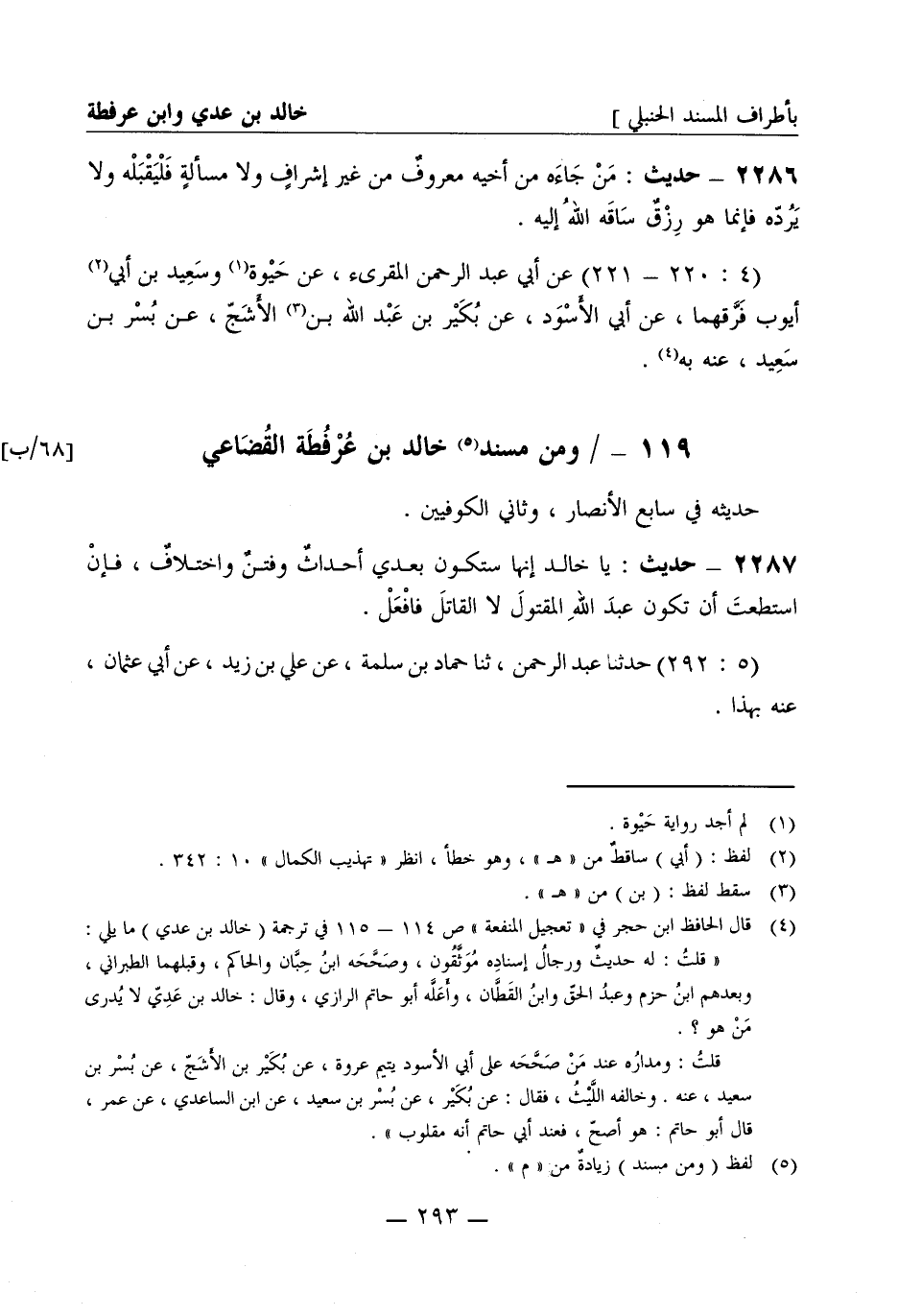 2287 - حديث: يا خالد إنها ستكون بعدي أحداث وفتن واختلاف فإن استطعت أن تكون عبد الله المقتول لا القاتل فافعل (5: 292) حدثنا عبد الرحمن ثنا حماد بن سلمة عن علي بن زيد عن أبي عثمان عنه بهذا