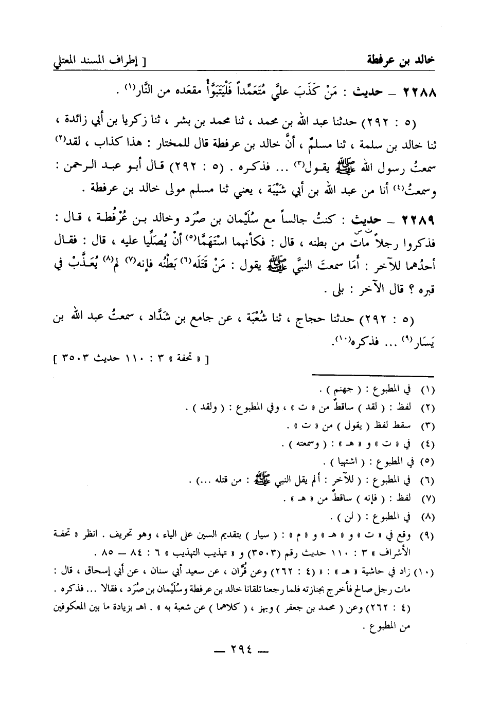 2288 - حديث: من كذب علي متعمدا فليتبوأ مقعده من النار (5: 292) حدثنا عبد الله بن محمد ثنا محمد بن بشر ثنا زكريا بن أبي زائدة ثنا خالد بن سلمة ثنا مسلم أن خالد بن عرفطة قال للمختار: هذا كذاب لقد سمعت رسول الله صَلَّى اللَّهُ عَلَيْهِ وَسَلَّمَ يقول ... . فذكره (5: 292) قال أبو عبد الرحمن وسمعت أنا من عبد الله بن أبي شيبة يعني ثنا مسلم مولى خالد بن عرفطة