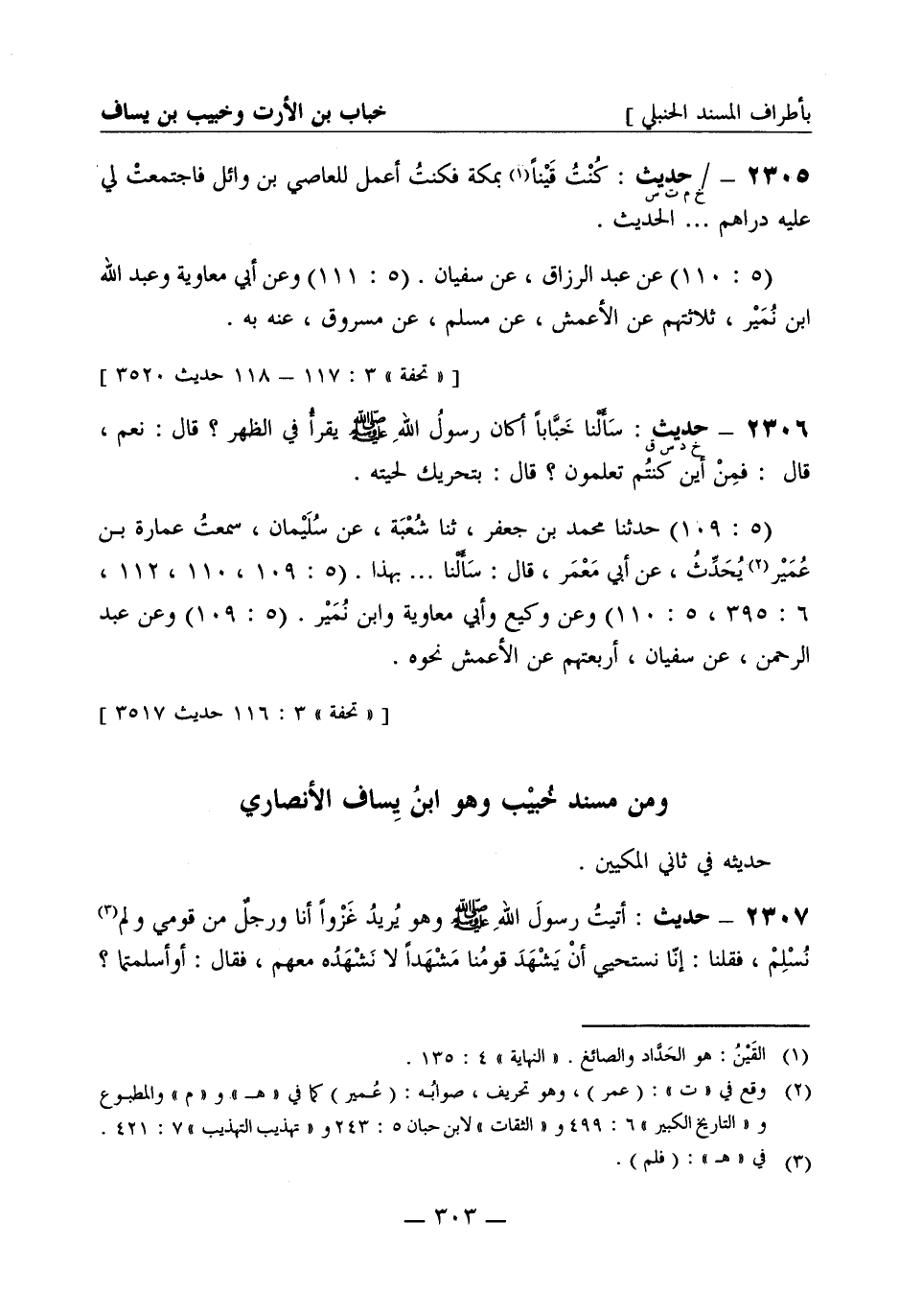 2306 -[خ د س ق] حديث: سألنا خبابا أكان رسول الله صَلَّى اللَّهُ عَلَيْهِ وَسَلَّمَ يقرأ في الظهر؟ قال: نعم قال: فمن أين كنتم تعلمون؟ قال: بتحريك لحيته (5: 109) حدثنا محمد بن جعفر ثنا شعبة عن سليمان سمعت عمارة بن عمير يحدث عن أبي معمر قال سألنا ... . بهذا (5: 109، 110، 112، 6: 395، 5: 110) وعن وكيع وأبي معاوية وابن نمير (5: 109) وعن عبد الرحمن عن سفيان أربعتهم عن الأعمش نحوه