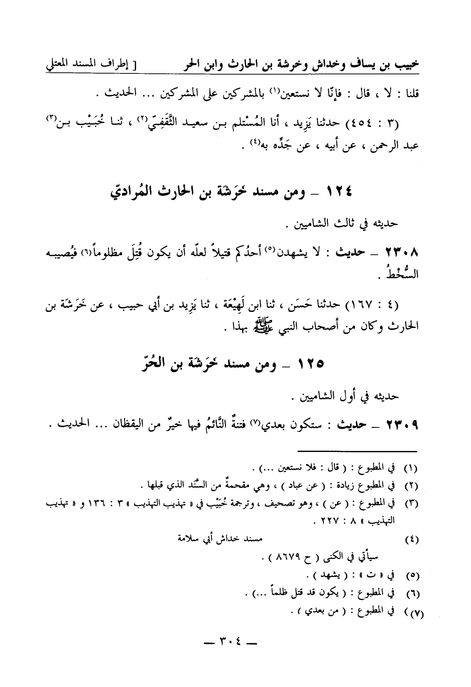2308 - حديث: لا يشهدن أحدكم قتيلا لعله أن يكون قتل مظلوما فيصيبه السخط (4: 167) حدثنا حسن ثنا ابن لهيعة ثنا يزيد بن أبي حبيب عن خرشة بن الحارث وكان من أصحاب النبي صَلَّى اللَّهُ عَلَيْهِ وَسَلَّمَ بهذا