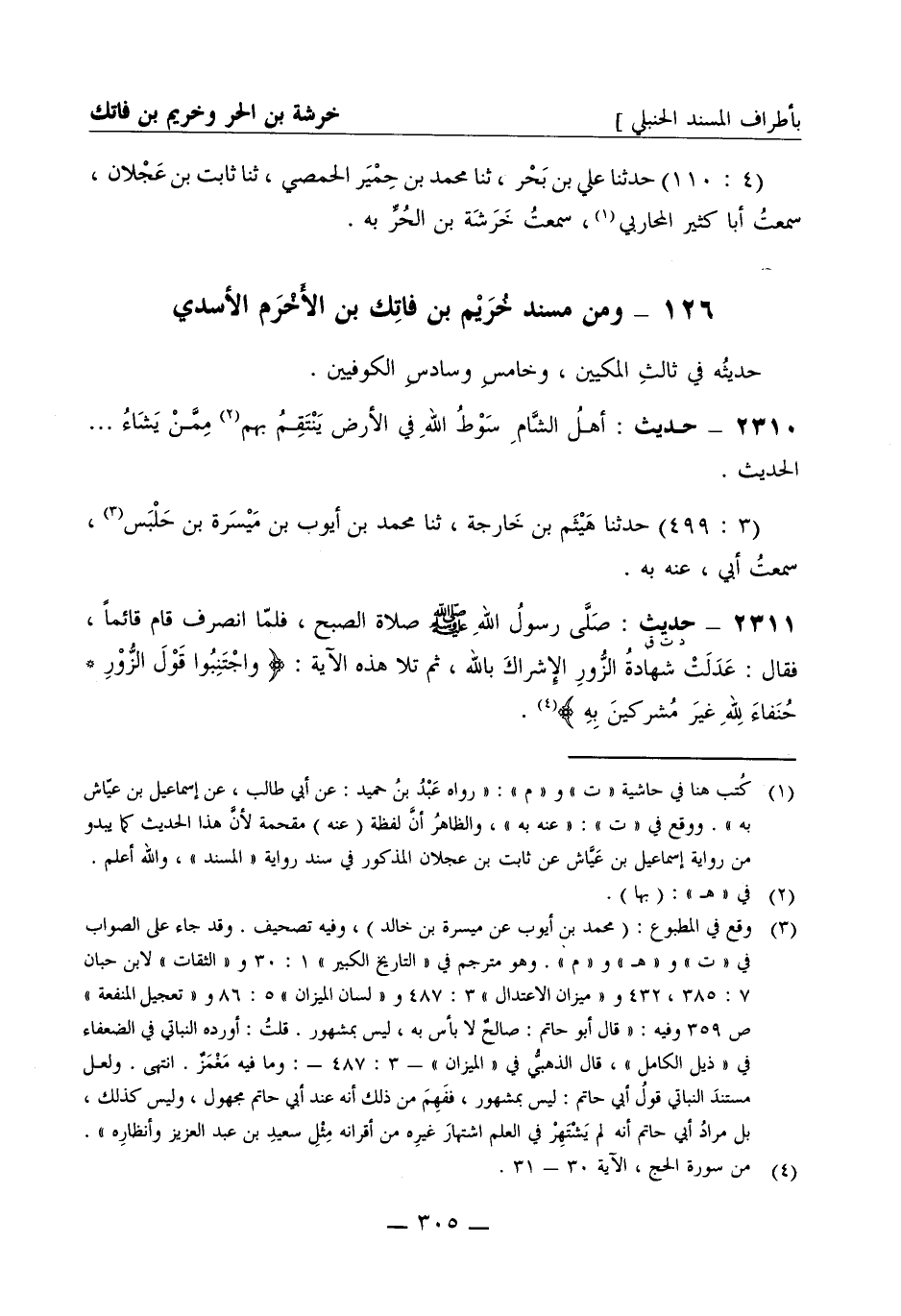 2311 -[د ت ق] حديث: صلى رسول الله صَلَّى اللَّهُ عَلَيْهِ وَسَلَّمَ صلاة الصبح فلما انصرف قام قائما فقال: عدلت شهادة الزور الإشراك بالله ثم تلا هذه الآية واجتنبوا قول الزور حنفاء لله غير مشركين به -[306]- (4: 321) حدثنا محمد بن عبيد ثنا سفيان العصفري عن أبيه عن حبيب بن النعمان الأسدي عنه به وهكذا رواه يعلى بن عبيد وغيره عن سفيان بن زياد العصفري وخالفهم مروان بن معاوية فرواه عن سفيان عن فاتك عن أيمن بن خزيم وقد مضى (ح 1112)