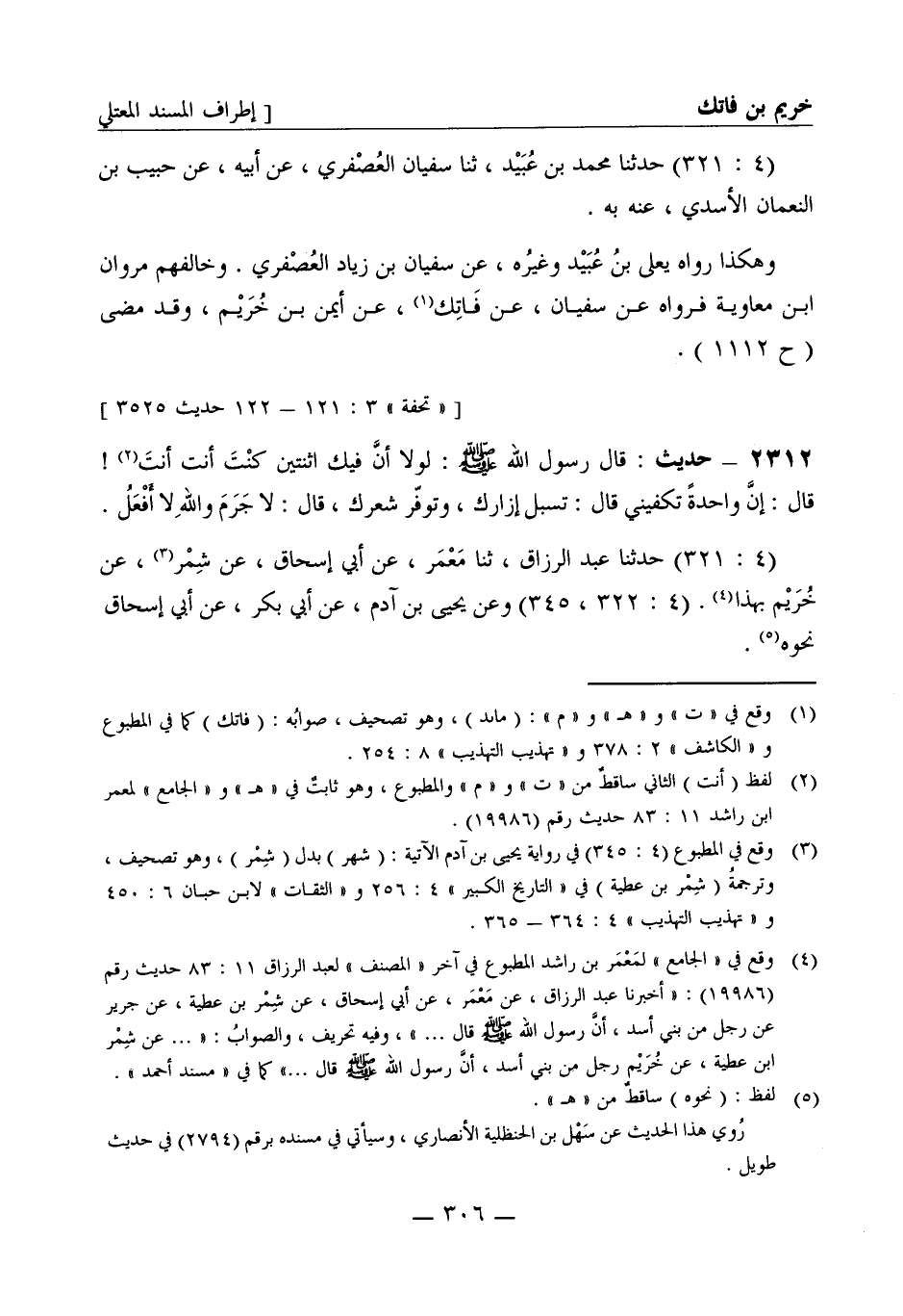 2312 - حديث: قال رسول الله صَلَّى اللَّهُ عَلَيْهِ وَسَلَّمَ: لولا أن فيك اثنتين كنت أنت أنت قال إن واحدة تكفيني قال تسبل إزارك وتوفر شعرك قال: لا جرم والله لا أفعل (4: 321) حدثنا عبد الرزاق ثنا معمر عن أبي إسحاق عن شمر عن خريم بهذا (4: 322، 345) وعن يحيى بن آدم عن أبي بكر عن أبي إسحاق نحوه