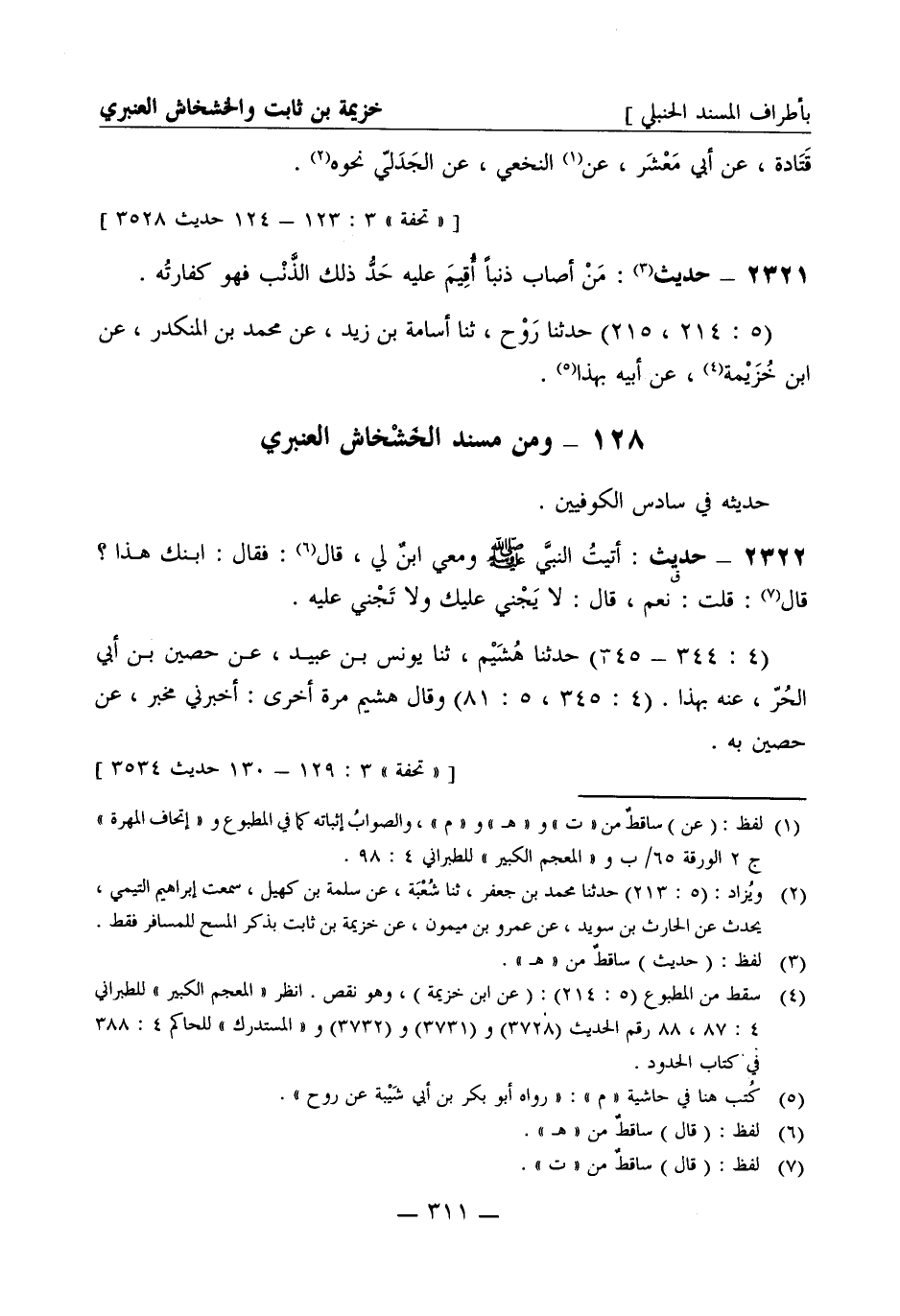 2321 - حديث: من أصاب ذنبا أقيم عليه حد ذلك الذنب فهو كفارته (5: 214، 215) حدثنا روح ثنا أسامة بن زيد عن محمد بن المنكدر عن ابن خزيمة عن أبيه بهذا