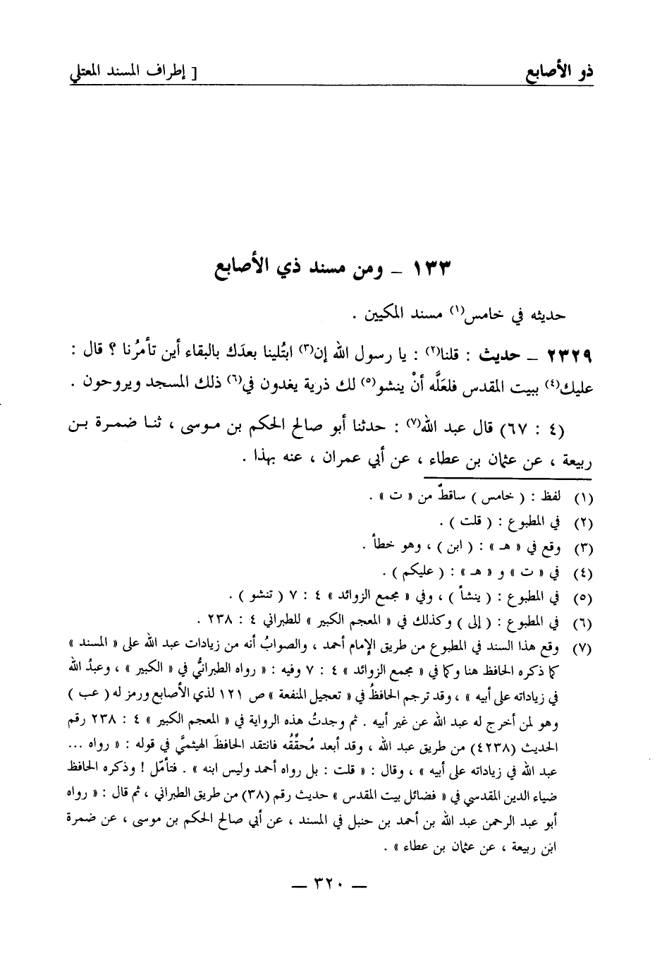 2329 - حديث: قلنا يا رسول الله إن ابتلينا بعدك بالبقاء أين تأمرنا؟ قال: عليك ببيت المقدس فلعله أن ينشو لك ذرية يغدون في ذلك المسجد ويروحون (4: 67) قال عبد الله حدثنا أبو صالح الحكم بن موسى ثنا ضمرة بن ربيعة عن عثمان بن عطاء عن أبي عمران عنه بهذا