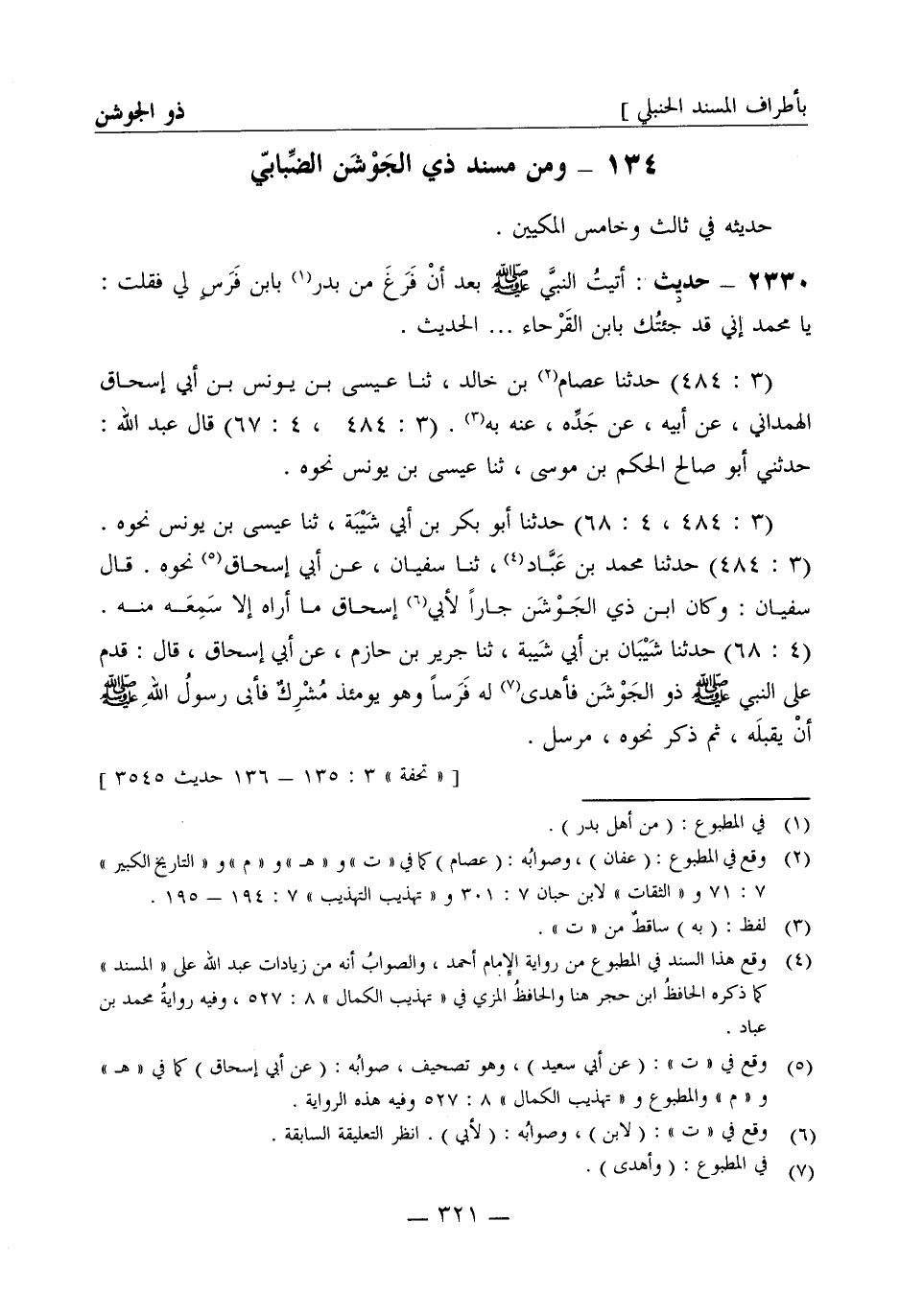 2330 -[د] حديث: أتيت النبي صَلَّى اللَّهُ عَلَيْهِ وَسَلَّمَ بعد أن فرغ من بدر بابن فرس لي فقلت يا محمد إني قد جئتك بابن القرحاء ... ... . الحديث (3: 484) حدثنا عصام بن خالد ثنا عيسى بن يونس بن أبي إسحاق الهمداني عن أبيه عن جده عنه به (3: 484، 4: 67) قال عبد الله حدثني أبو صالح الحكم بن موسى ثنا عيسى بن يونس نحوه (3: 484، 4: 68) حدثنا أبو بكر بن أبي شيبة ثنا عيسى بن يونس نحوه (3: 484) حدثنا محمد بن عباد ثنا سفيان عن أبي إسحاق نحوه قال سفيان وكان ابن ذي الجوشن جارا لأبي إسحاق ما أراه إلا سمعه منه (4: 68) حدثنا شيبان بن أبي شيبة ثنا جرير بن حازم عن أبي إسحاق قال قدم على النبي صَلَّى اللَّهُ عَلَيْهِ وَسَلَّمَ ذو الجوشن فأهدى له فرسا وهو يومئذ مشرك فأبى رسول الله صَلَّى اللَّهُ عَلَيْهِ وَسَلَّمَ أن يقبله ثم ذكر نحوه مرسل