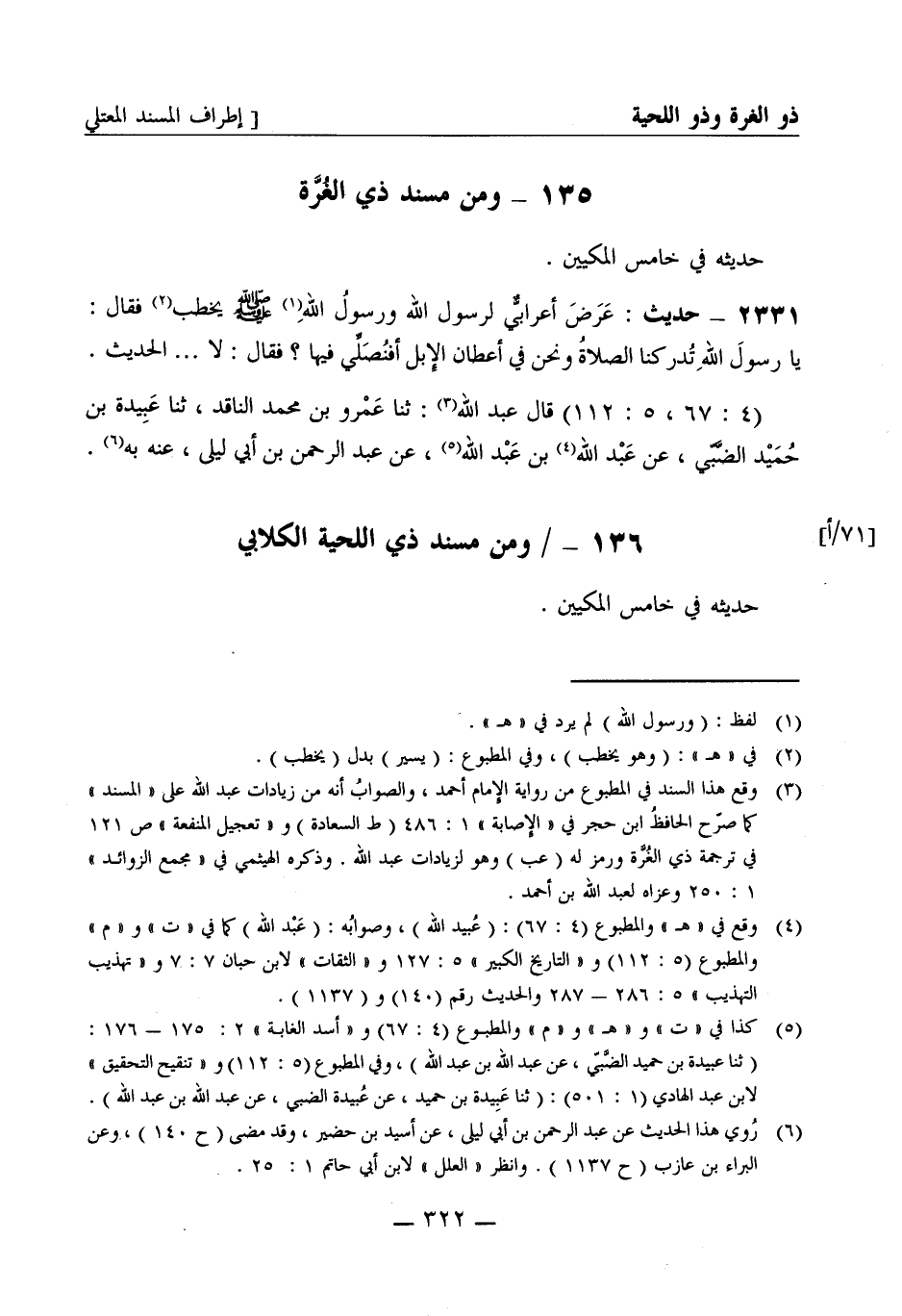 2331 - حديث: عرض أعرابي لرسول الله ورسول الله صَلَّى اللَّهُ عَلَيْهِ وَسَلَّمَ يخطب فقال: يا رسول الله تدركنا الصلاة ونحن في أعطان الإبل أفنصلي فيها؟ فقال: لا ... ... . الحديث (4: 67، 5: 112) قال عبد الله ثنا عمرو بن محمد الناقد ثنا عبيدة بن حميد الضبي عن عبد الله بن عبد الله عن عبد الرحمن بن أبي ليلى عنه به