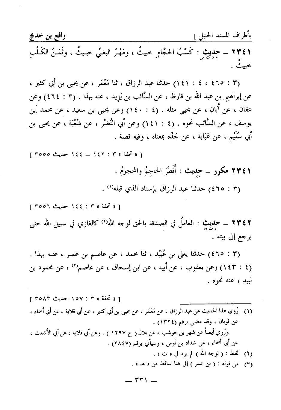 2341 -[م د ت س] حديث: كسب الحجام خبيث ومهر البغي خبيث وثمن الكلب خبيث (3: 465، 4: 141) حدثنا عبد الرزاق ثنا معمر عن يحيى بن أبي كثير عن إبراهيم بن عبد الله بن قارظ عن السائب بن يزيد عنه بهذا (3: 464) وعن عفان عن أبان عن يحيى مثله (4: 140) وعن يحيى بن سعيد عن محمد بن يوسف عن السائب نحوه (4: 141) وعن أبي النضر عن شعبة عن يحيى بن أبي سليم عن عباية عن جده بمعناه وفيه قصة