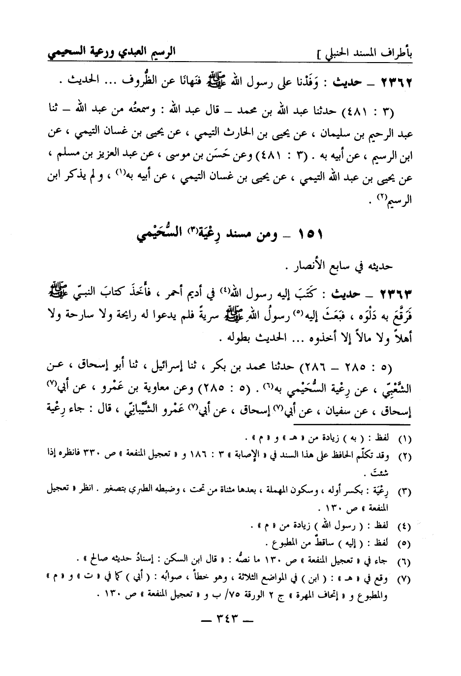 2363 - حديث: كتب إليه رسول الله في أديم أحمر فأخذ كتاب النبي صَلَّى اللَّهُ عَلَيْهِ وَسَلَّمَ فرقع به دلوه فبعث إليه رسول الله صَلَّى اللَّهُ عَلَيْهِ وَسَلَّمَ سرية فلم يدعوا له رايحة ولا سارحة ولا أهلا ولا مالا إلا أخذوه..... الحديث بطوله (5: 285 - 286) حدثنا محمد بن بكر ثنا إسرائيل ثنا أبو إسحاق عن الشعبي عن رعية السحيمي به (5: 285) وعن معاوية بن عمرو عن أبي إسحاق عن سفيان عن أبي إسحاق عن أبي عمرو الشيباني قال: جاء رعية -[344]- السحيمي إلى النبي صَلَّى اللَّهُ عَلَيْهِ وَسَلَّمَ فقال: أغير على ولدي ومالي فقال رسول الله صَلَّى اللَّهُ عَلَيْهِ وَسَلَّمَ أما المال فقد اقتسم ... ... فذكر بعضه وهذا صورته مرسل