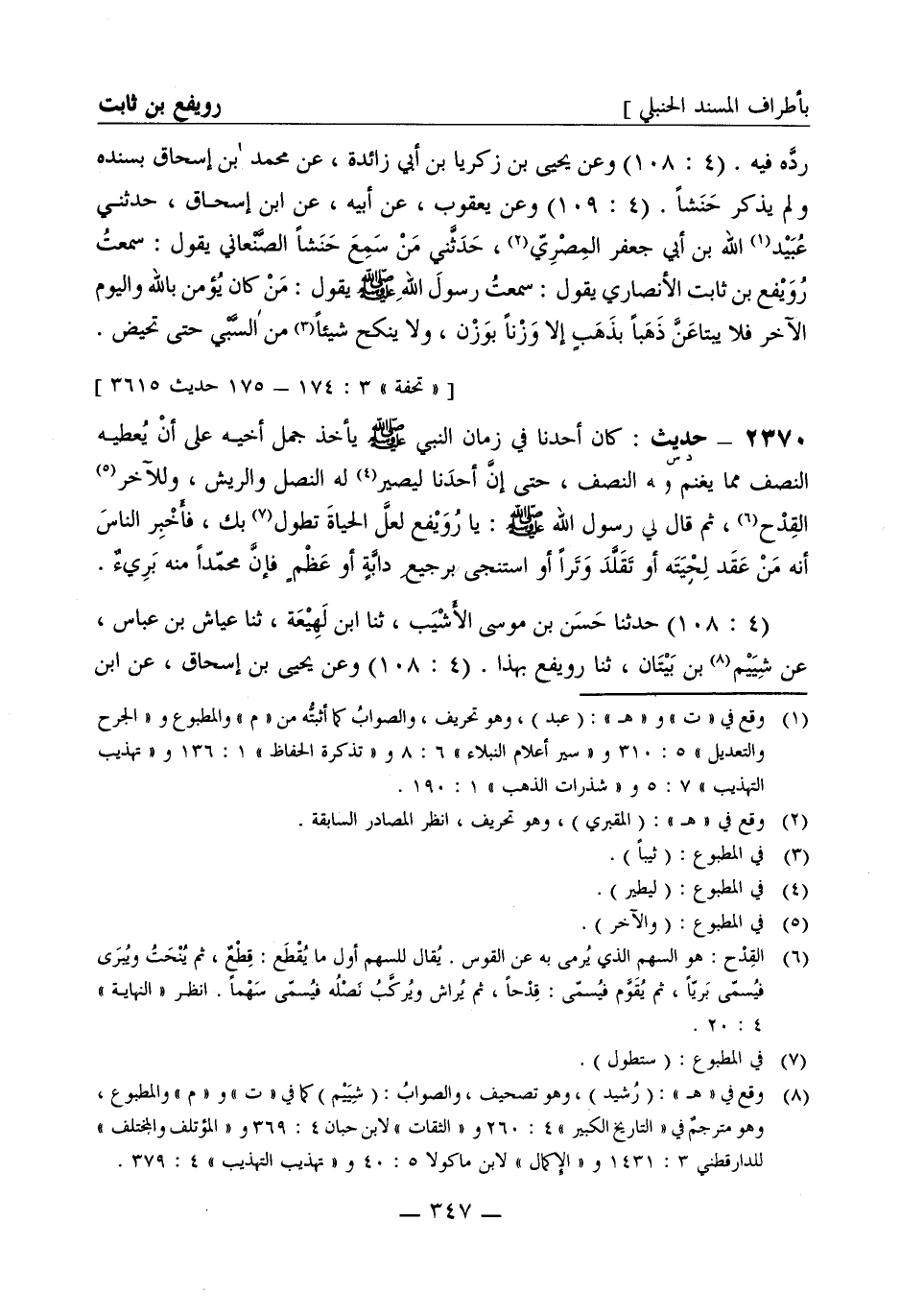 2370 -[د س] حديث: كان أحدنا في زمان النبي صَلَّى اللَّهُ عَلَيْهِ وَسَلَّمَ يأخذ جمل أخيه على أن يعطيه النصف مما يغنم وله النصف حتى إن أحدنا ليصير له النصل والريش وللآخر القدح ثم قال لي رسول الله صَلَّى اللَّهُ عَلَيْهِ وَسَلَّمَ يا رويفع لعل الحياة تطول بك فأخبر الناس أنه من عقد لحيته أو تقلد وترا أو استنجى برجيع دابة أو عظم فإن محمدا منه بريء (4: 108) حدثنا حسن بن موسى الأسيب ثنا ابن لهيعة ثنا عياش بن عباس عن شييم بن بيتان ثنا رويفع بهذا (4: 108) وعن يحيى بن إسحاق عن ابن -[348]- لهيعة نحوه (4: 108) وأعاد الجملة الأولى عن يحيى بن إسحاق بسنده وزاد فيه عن شييم عن أبي سالم عن شيبان بن أمية عن رويفع (4: 109) وعن يحيى بن إسحاق عن مفضل هو ابن فضالة عن عياش عن شييم عن شيبان عن رويفع بتمامه وأوله استعمل مسلمة بن مخلد رويفع بن ثابت على أسفل الأرض