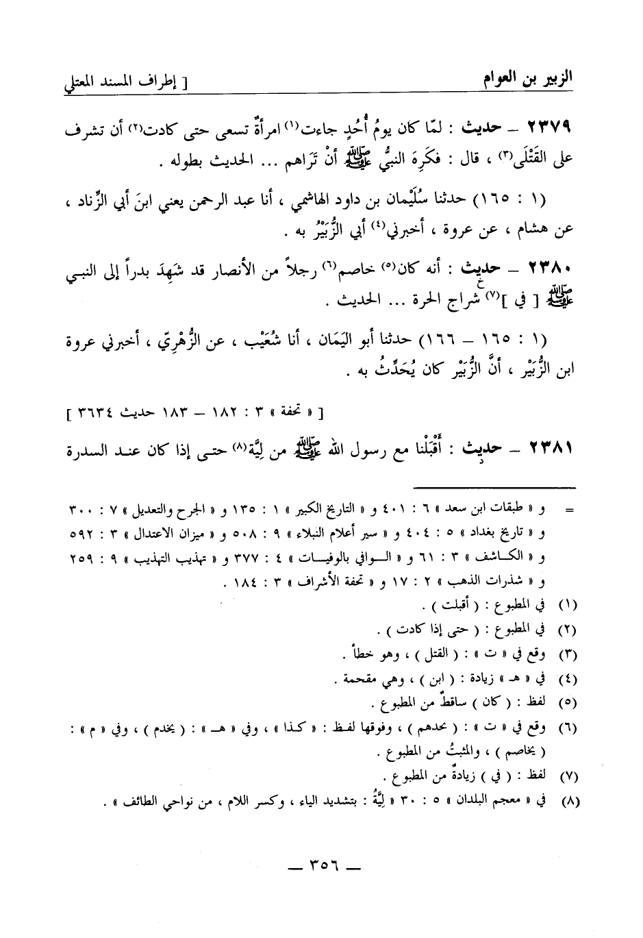 2379 - حديث: لما كان يوم أحد جاءت امرأة تسعى حتى كادت أن تشرف على القتلى قال: فكره النبي صَلَّى اللَّهُ عَلَيْهِ وَسَلَّمَ أن تراهم ... الحديث بطوله (165: 1) حدثنا سليمان بن داود الهاشمي أنا عبد الرحمن يعني ابن أبي الزناد عن هشام عن عروة أخبرني أبي الزبير به