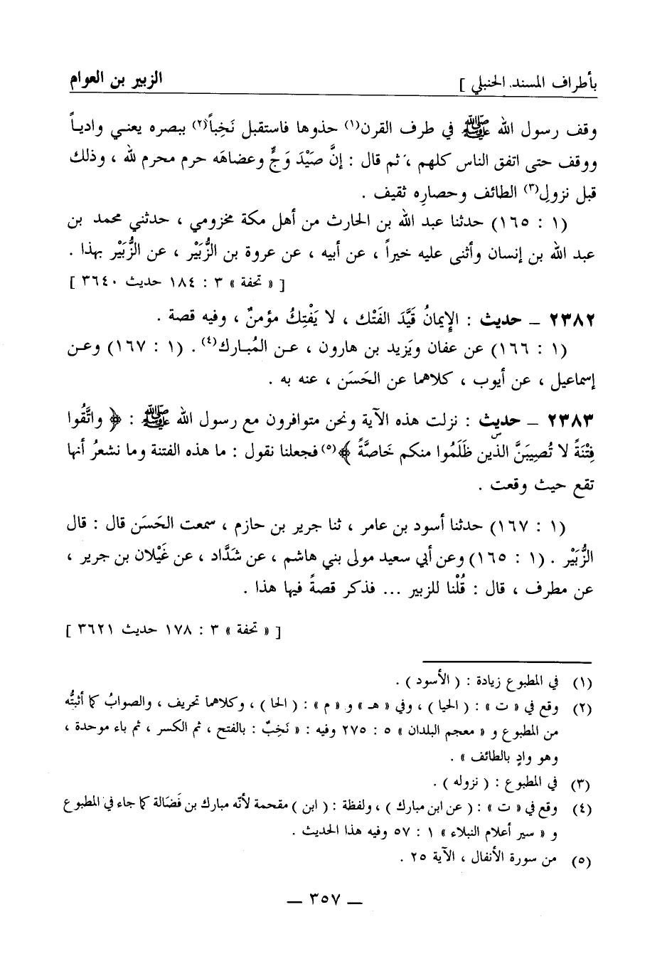 2383 -[س] حديث: نزلت هذه الآية ونحن متوافرون مع رسول الله صَلَّى اللَّهُ عَلَيْهِ وَسَلَّمَ: واتقوا فتنة لا تصيبن الذين ظلموا منكم خاصة فجعلنا نقول: ما هذه الفتنة وما نشعر أنها تقع حيث وقعت (167: 1) حدثنا أسود بن عامر ثنا جرير بن حازم سمعت الحسن قال: قال الزبير (165: 1) وعن أبي سعيد مولى بني هاشم عن شداد عن غيلان بن جرير عن مطرف قال: قلنا للزبير ... فذكر قصة فيه هذا