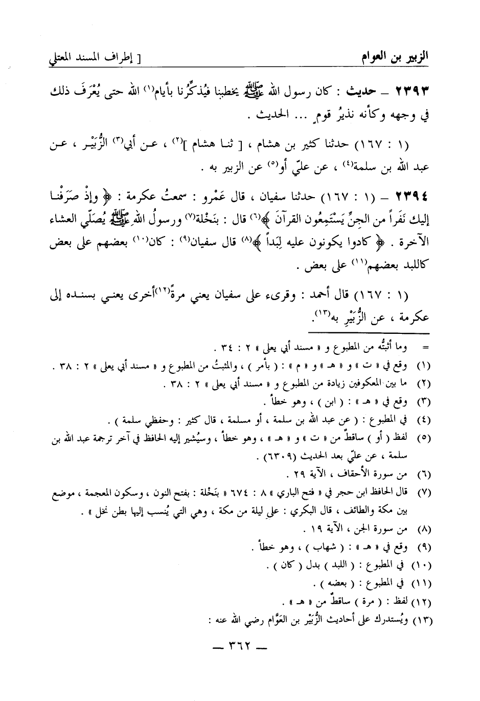 2393 - حديث: كان رسول الله صَلَّى اللَّهُ عَلَيْهِ وَسَلَّمَ يخطبنا فيذكرنا بأيام الله حتى يعرف ذلك في وجهه وكأنه نذير قوم ... الحديث (167: 1) حدثنا كثير بن هشام ثنا هشام عن أبي الزبير عن عبد الله بن سلمة عن علي أو عن الزبير به