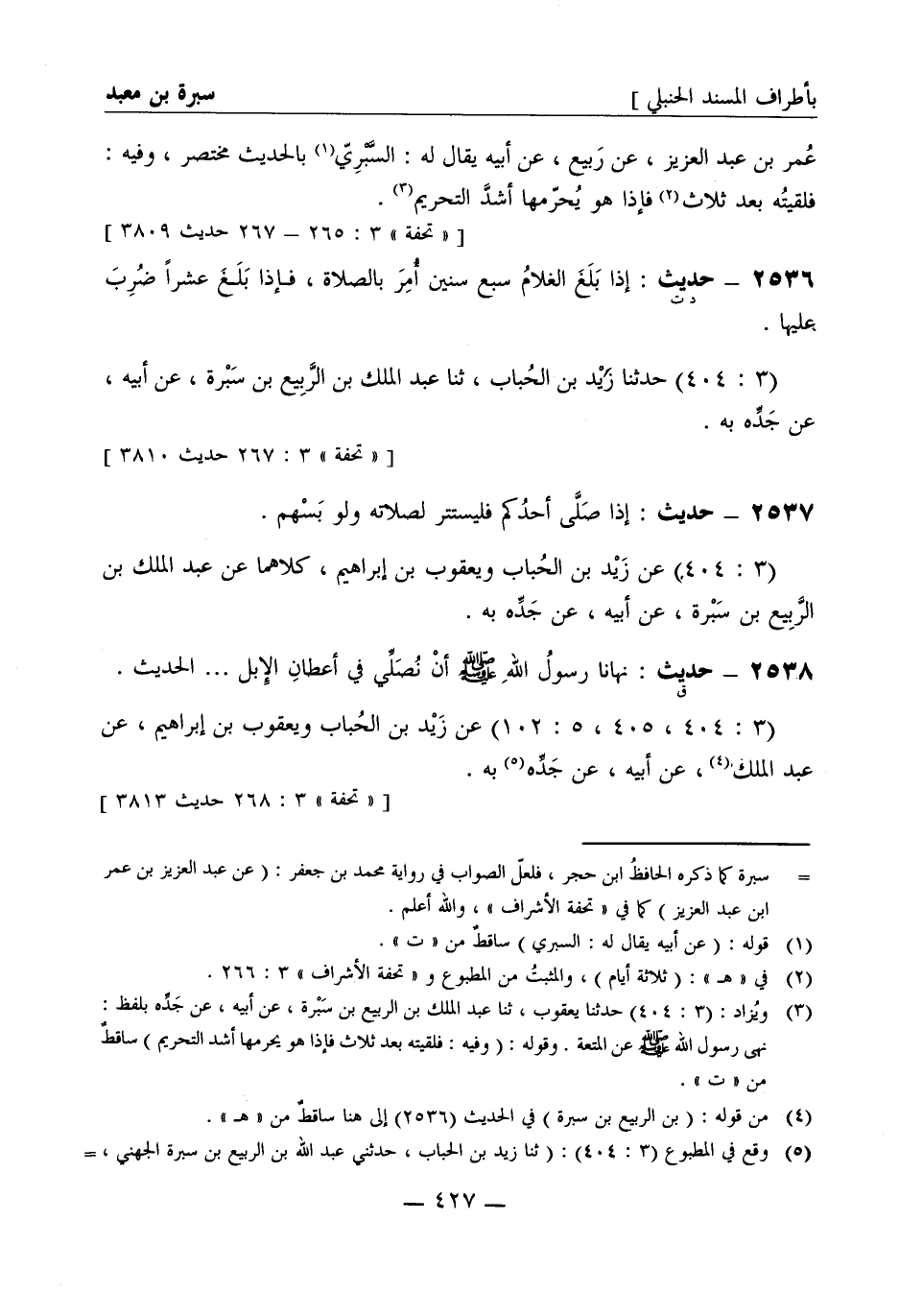 2537 - حديث: إذا صلى أحدكم فليستتر لصلاته ولو بسهم (3: 404) عن زيد بن الحباب ويعقوب بن إبراهيم كلاهما عن عبد الملك بن الربيع بن سبرة عن أبيه عن جده به