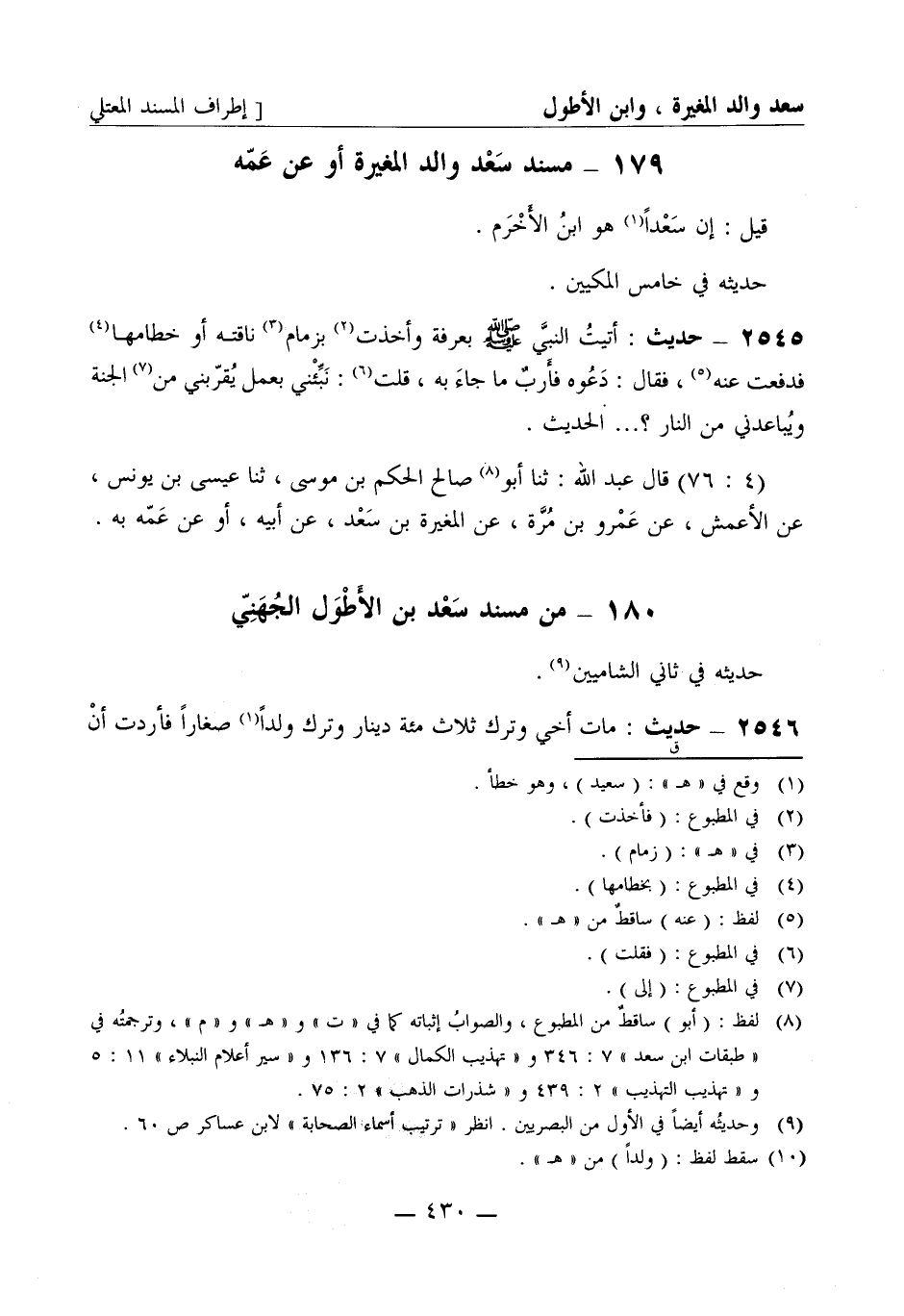 مسند سعد والد المغيرة أو عن عمه قيل إن سعدا هو ابن الأخرم حديثه في خامس المكيين