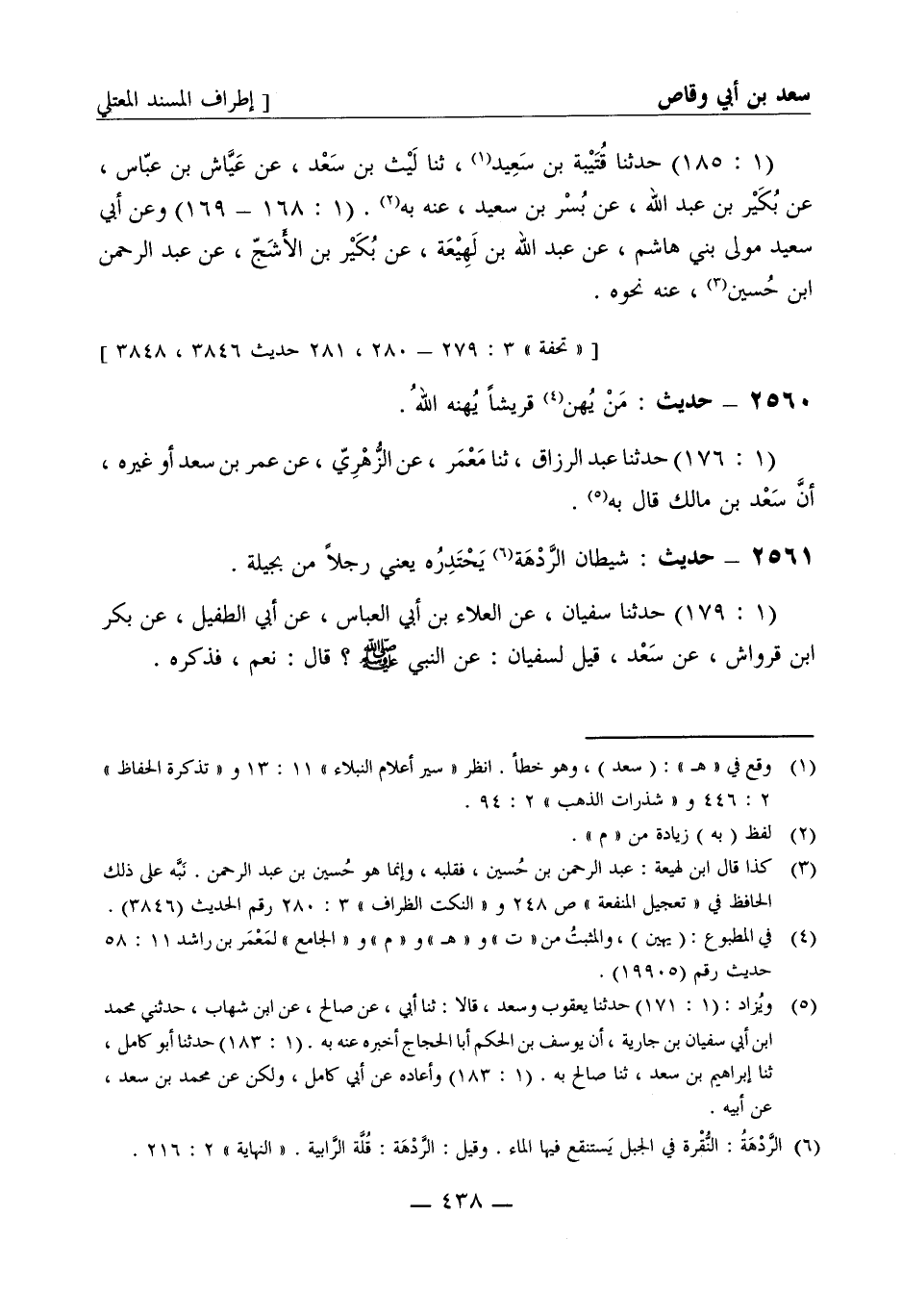 2560 - حديث: من يهن قريشا يهنه الله (1: 176) حدثنا عبد الرزاق ثنا معمر عن الزهري عن عمر بن سعد أو غيره أن سعد بن مالك قال به