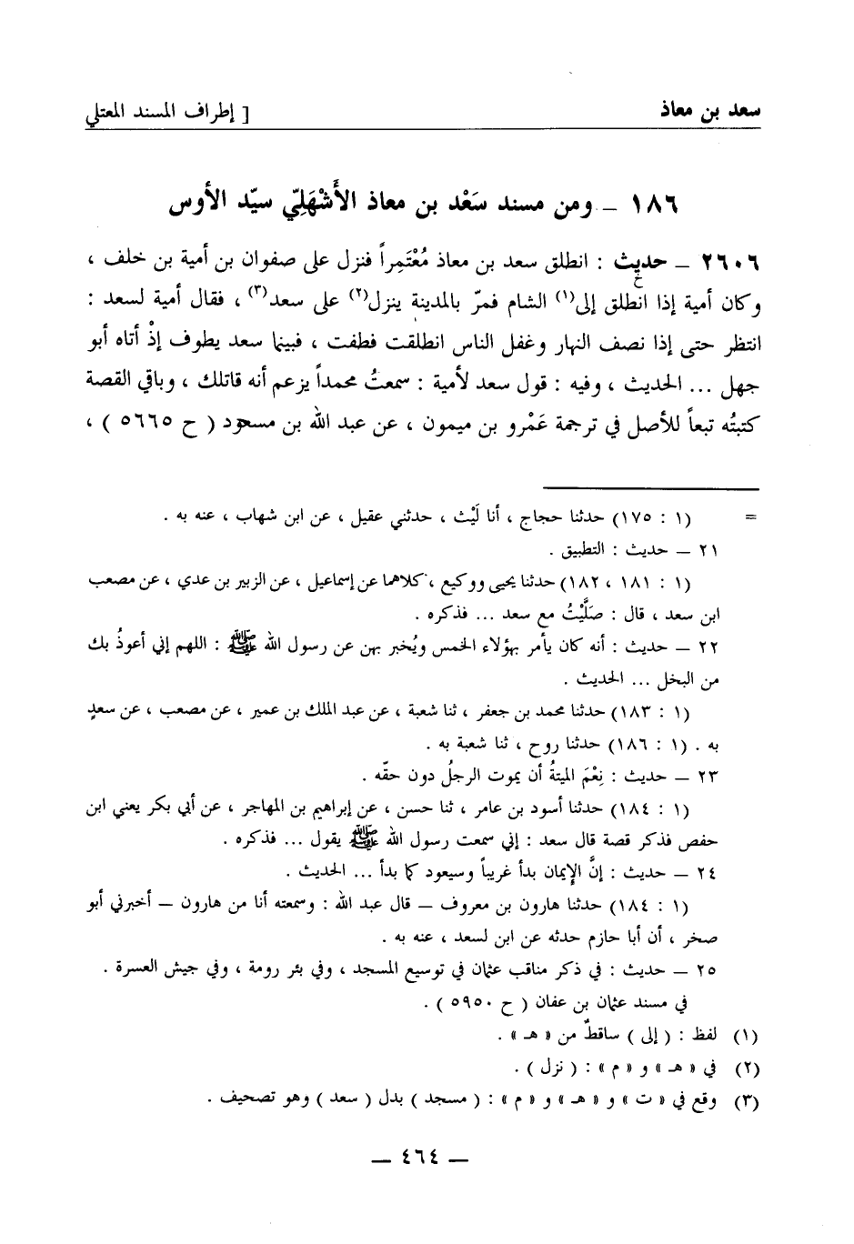 2606 -[خ] حديث: انطلق سعد بن معاذ معتمرا فنزل على صفوان بن أمية بن خلف وكان أمية إذا انطلق إلى الشام فمر بالمدينة ينزل على سعد فقال أمية لسعد انتظر حتى إذا نصف النهار وغفل الناس انطلقت فطفت فبينما سعد يطوف إذ أتاه أبو جهل ... ... . الحديث وفيه قول سعد لأمية سمعت محمدا يزعم أنه قاتلك وباقي القصة كتبته تبعا للأصل في ترجمة عمرو بن ميمون عن عبد الله بن مسعود (ح -[465]- 5665) وبعضه كما ترى يصلح أن يكتب في هذه الترجمة فلذا نبهت عليه والله الموفق