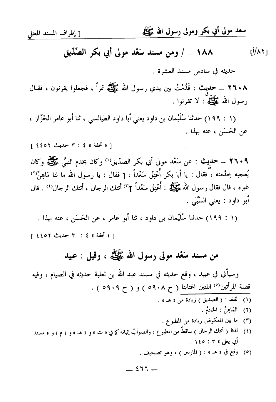 2610 - من مسند سعد مولى رسول الله صَلَّى اللَّهُ عَلَيْهِ وَسَلَّمَ وقيل عبيد وسيأتي في عبيد وقع حديثه في مسند عبد الله بن ثعلبة حديثه في الصيام وفيه قصة المرأتين اللتين اغتابتا (ح 5908) و (ح 5909) .