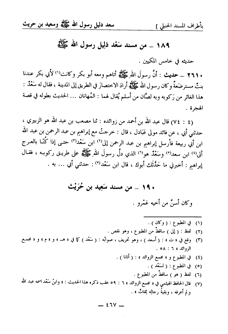 2611 - حديث: أن رسول الله صَلَّى اللَّهُ عَلَيْهِ وَسَلَّمَ أتاهم ومعه أبو بكر وكانت لأبي بكر عندنا بنت مسترضعة وكان رسول الله صَلَّى اللَّهُ عَلَيْهِ وَسَلَّمَ أراد الاختصار في الطريق إلى المدينة فقال له سعد هذا الغائر من ركوبه وبه لصان من أسلم يقال لهما المهانان ... ... . الحديث بطوله في قصة الهجرة (4: 74) قال عبد الله بن أحمد من زوائده ثنا مصعب بن عبد الله هو الزبيري حدثني أبي عن فائد مولى عبادل قال خرجت مع إبراهيم بن عبد الرحمن بن عبد الله بن أبي ربيعة فأرسل إبراهيم بن عبد الرحمن إلى ابن سعد حتى إذا كنا بالعرج أتى ابن سعد وسعد هو الذي دل رسول الله صَلَّى اللَّهُ عَلَيْهِ وَسَلَّمَ على طريق ركوبه فقال إبراهيم أخبرني ما حدثك أبوك قال ابن سعد حدثني أبي ... . به