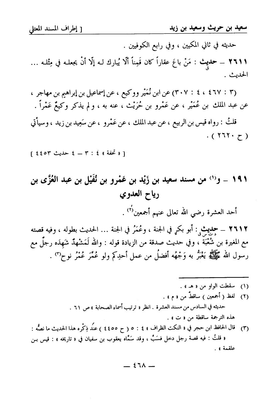 ومن مسند سعيد بن زيد بن عمرو بن نفيل بن عبد العزى بن رياح العدوي أحد العشرة رضي الله تعالى عنهم أجمعين