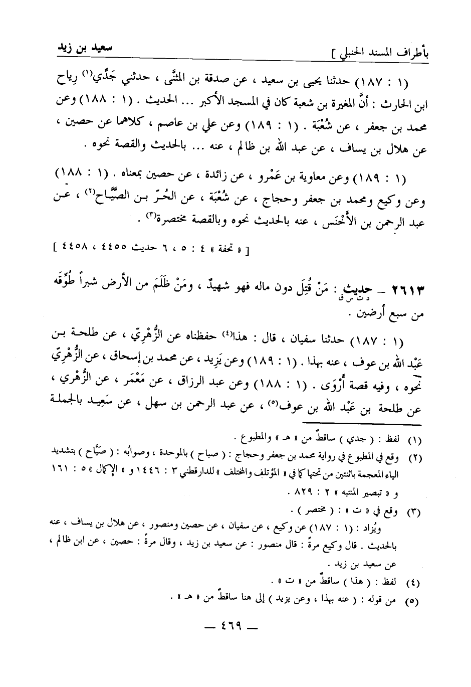 2614 -[د ت س ق] حديث: من قتل دون ماله فهو شهيد ومن ظلم من الأرض شبرا طوقه من سبع أرضين (1: 187) حدثنا سفيان قال هذا حفظناه عن الزهري عن طلحة بن عبد الله بن عوف عنه بهذا (1: 189) وعن يزيد عن محمد بن إسحاق عن الزهري نحوه وفيه قصة أروى (1: 188) وعن عبد الرزاق عن معمر عن الزهري عن طلحة بن عبد الله بن عوف عن عبد الرحمن بن سهل عن سعيد بالجملة -[470]- الثانية قال معمر وبلغني عن الزهري ولم أسمعه منه زاد في هذا الحديث ومن قتل دون ماله فهو شهيد (1: 189) وعن أبي اليمان عن شعيب عن الزهري بإسناد معمر بالجملة الثانية (1: 188) وعن يحيى وابن نمير عن هشام عن أبيه عروة عنه بذلك (1: 188، 190) وعن يزيد بن هارون عن ابن أبي ذئب عن الحارث بن عبد الرحمن عن أبي سلمة أن مروان قال اذهبوا فأصلحوا بين هذين لسعيد وأروى..... فذكر معناه ولم يذكر الجمل الأولى وزاد ومن تولى مولى قوم بغير إذنهم فعليه لعنة الله ومن اقتطع مال امرئ مسلم بيمين فلا بارك الله له فيها