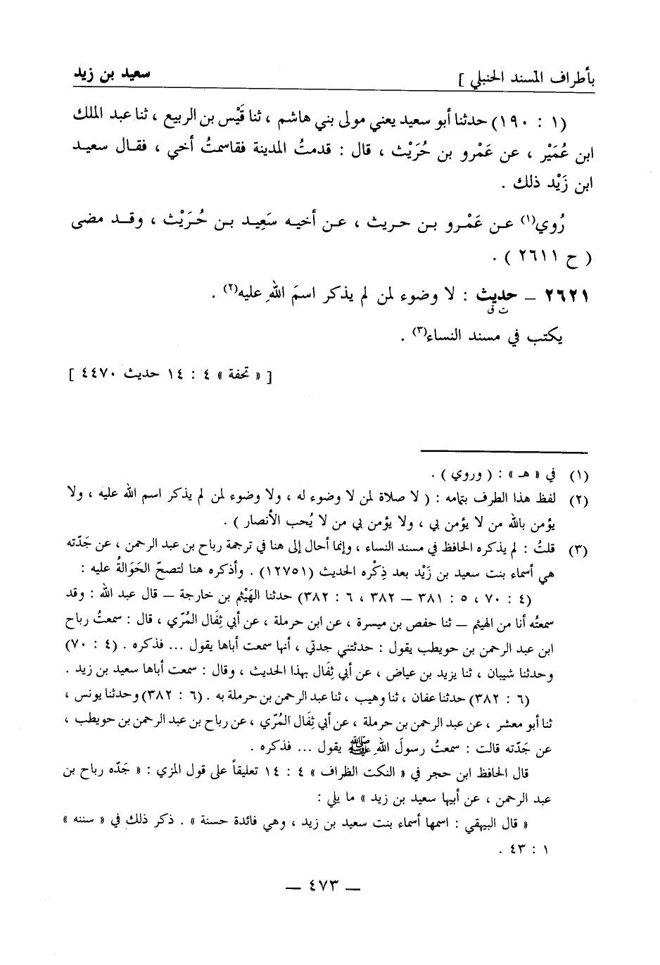 حديث: لا وضوء لمن لم يذكر اسم الله عليه يكتب في مسند النساء