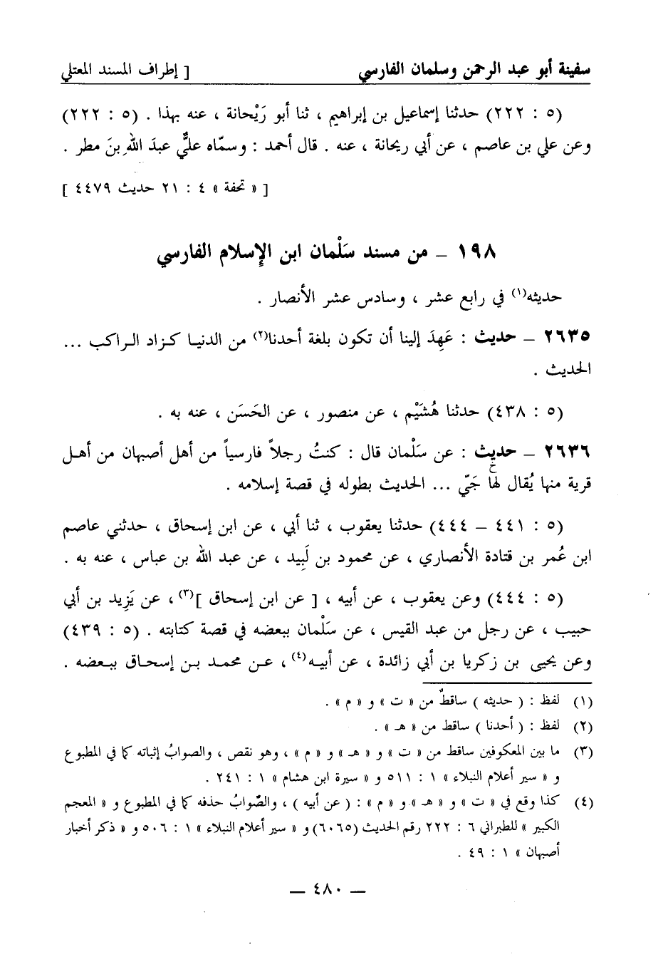 2636 -[خ] حديث: عن سلمان قال: كنت رجلا فارسيا من أهل أصبهان من أهل قرية منها يقال لها جي ... ... . الحديث بطوله في قصة إسلامه (5: 441 - 444) حدثنا يعقوب ثنا أبي عن ابن إسحاق حدثني عاصم بن عمر بن قتادة الأنصاري عن محمود بن لبيد عن عبد الله بن عباس عنه به (5: 444) وعن يعقوب عن أبيه عن ابن إسحاق عن يزيد بن أبي حبيب عن رجل من عبد القيس عن سلمان ببعضه في قصة كتابته (5: 439) وعن يحيى بن زكريا بن أبي زائدة عن أبيه عن محمد بن إسحاق ببعضه -[481]- (5: 438) وعن أبي كامل عن إسرائيل عن أبي إسحاق عن أبي قرة الكندي عنه بقصته مختصرة وفيها من الزيادة فحدثته عن الرجل فقلت أيدخل الجنة يا رسول الله فإنه حدثني أنك نبي؟ فقال لن يدخل الجنة إلا نفس مسلمة ... ... . الحديث (5: 439) وعن يحيى بن زكريا عن أبيه عن أبي إسحاق عن آل أبي قرة عن سلمان ببعضه وليس فيه الزيادة (5: 437) وعن يحيى بن إسحاق عن شريك عن عبيد المكتب عن أبي الطفيل عنه ببعضه كان النبي صَلَّى اللَّهُ عَلَيْهِ وَسَلَّمَ يقبل الهدية ولا يقبل الصدقة (5: 437) قال عبد الله وحدثناه علي بن حكيم ثنا شريك نحوه (5: 440) وعن عفان عن حماد بن سلمة عن علي بن زيد عن أبي عثمان النهدي عن سلمان بطرف منه أوله كاتبت أهلي على أن أغرس لهم خمسين فسيله ... ... . الحديث